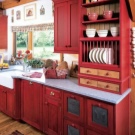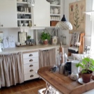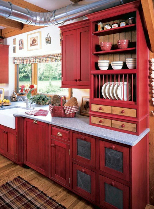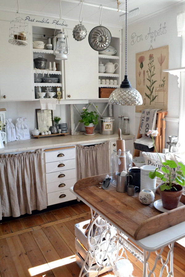 Ländliche Motive in der Gestaltung der Küche werden immer relevant sein, denn die Küche ist untrennbar mit der Landwirtschaft verbunden. Abflussland kann modisch und sehr originell aussehen. Dieser Stil ist durch das Vorhandensein von grobem Holz, Ziegelwänden, karierten Stoffen, einer großen Anzahl von Schubladen und Haken für die Lagerung gekennzeichnet. Ein ganz besonderer Ort ist hier Licht.