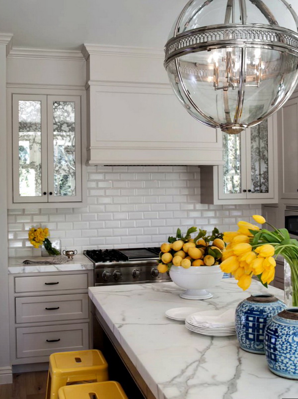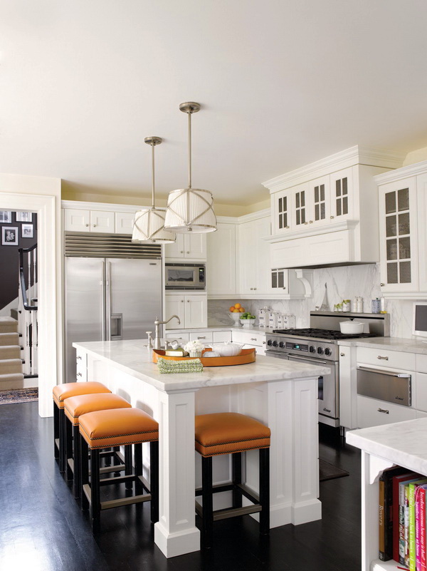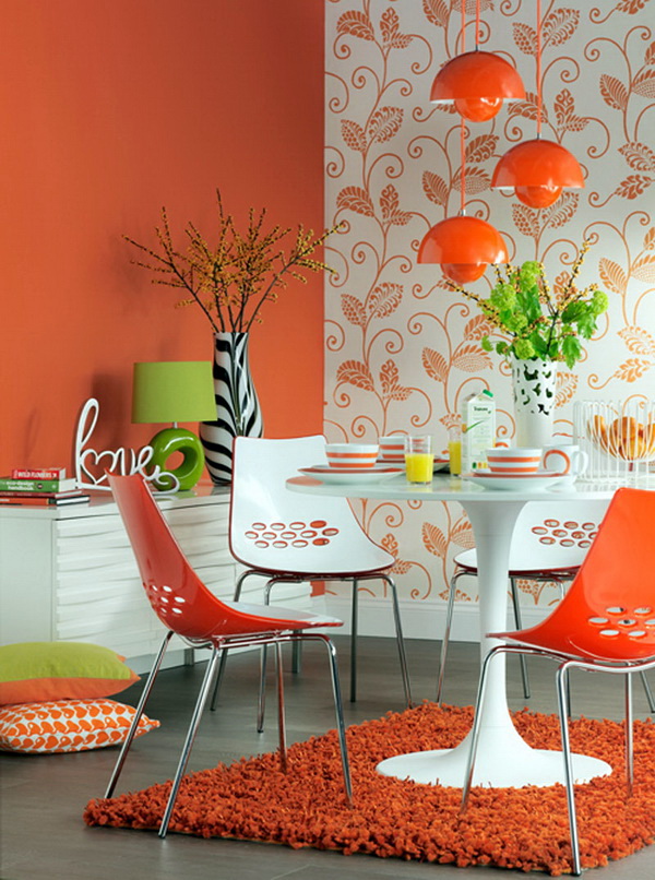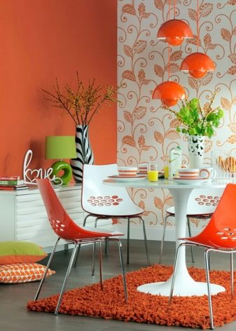 Besonders populär und orange Farbe. Eine Küche mit einem orangefarbenen Dekor wird selbst an einem regnerischen Tag sonnig aussehen, und orangefarbene Lampen lassen Sie nicht die Sonne und den Sommer vergessen.
