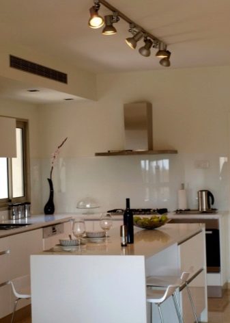 - Sie sollten nicht sparen, wenn Sie die Küche anzünden und sich für einen Punkt in der Mitte der Küche entscheiden. Eine solche Beleuchtung reicht nicht aus, um die gesamte Küche, auch die kleinsten, abzudecken.