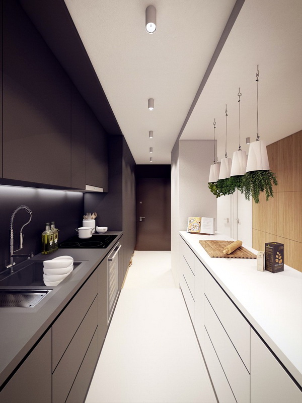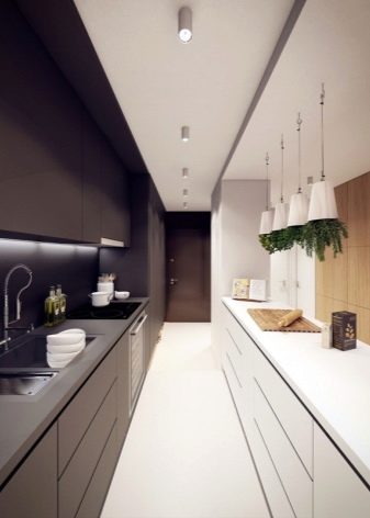 Eine kleine Küche ist kein Grund, nicht über die Organisation der Beleuchtung nachzudenken. Sie sollten die Auswahl nicht an einem Element in der Mitte des Raumes stoppen. Die Raumzonierung ist in einer solchen Situation besonders wichtig, da es in einer solchen Küche viel schwieriger ist, alle notwendigen Geräte unterzubringen. Für eine kleine Küche brauchen Sie weniger Verbrauchsmaterialien und weniger Lichtelemente, aber sie sind genauso wichtig wie für eine große.