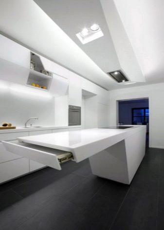 Dieser Stil zeichnet sich durch strenge, geradlinige Linien in allen Gestaltungselementen aus: vom Möbel bis zur Fertigstellung der Wände. Für die Küche in diesem Stil ist eine strenge Zoneneinteilung wichtig. LED-Beleuchtung wird hier sehr natürlich aussehen, fest und versteckt vor neugierigen Blicken unter den Regalen.