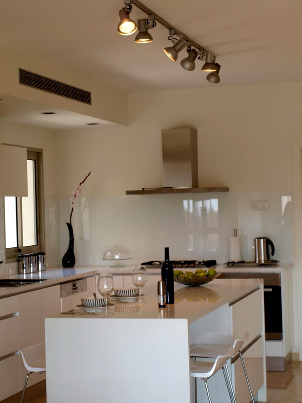 - Es ist sehr wichtig, dass ein einzelnes Licht über dem Arbeitsbereich angebracht wird. Die Beleuchtung dieser Zone sollte so organisiert sein, dass die Hände angezündet werden.Wenn das Licht von hinten gerichtet wird, wird der Kochvorgang durch den auf die Arme fallenden Schatten viel komplizierter.