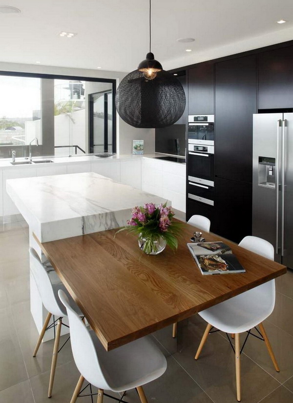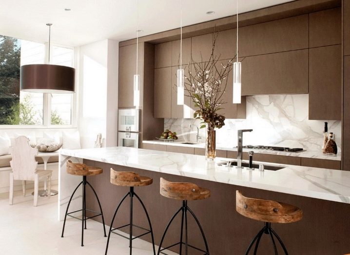 - Der zentrale Platz einer Küche ist der Esstisch. Das logischste und wichtigste ist es, das größte und größte Beleuchtungselement darüber zu stellen. Über der Arbeitsplatte können Sie einen Deckenleuchter mit mehreren Hörnern aufhängen. Es kann flach oder hängend, frillig oder rustikal sein, alles hängt vom Geschmack und Design der Küche ab.