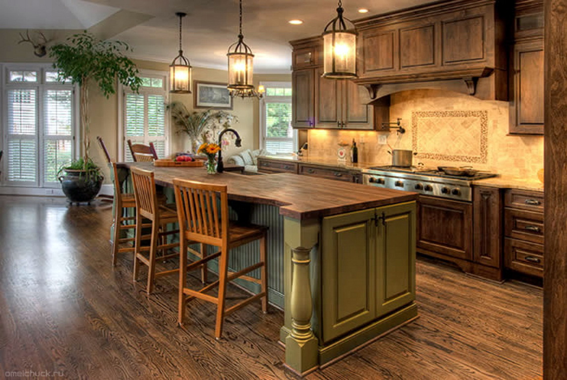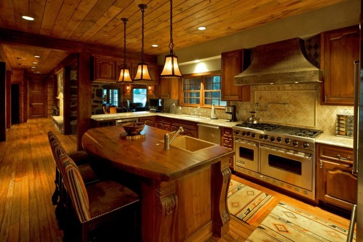 Alles in dieser Küche sieht umständlich und hart aus. Natürlich sollte die Beleuchtung einer solchen Küche mit dem Gesamtstil übereinstimmen. Für eine solche Küche eignen sich perfekt geschmiedete Lampen oder Lampen mit Holzdekor. Die Lampe aus Hirschgeweih wird auch gut aussehen.