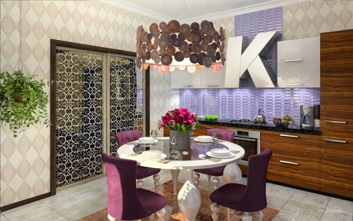 Die Beleuchtung einer solchen Küche sollte ziemlich hell, aber prägnant sein.Der zentrale Platz wird den Essbereich beleuchten. Hier können Sie einen großen Kronleuchter mit kerzenförmigen Hörnern oder hängenden Textilglocken platzieren. Der Rest der Beleuchtung sollte so unauffällig wie möglich gemacht werden.