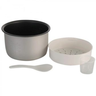 - Eine SchüsselMit einer speziellen Antihaftschicht überzogen (diese Beschichtung ermöglicht die Verwendung des Küchengeräts ohne Verwendung von Öl oder anderem Fett). Volumen können von ziemlich bescheidenem, entworfen für 2 Personen, zu groß sein, in dem Sie 5 - 6 Portionen kochen können.