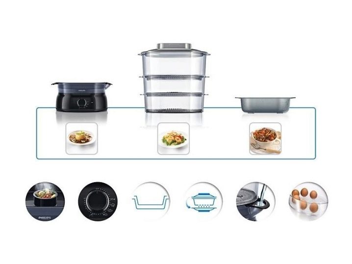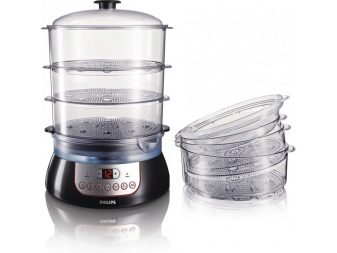 Ein weiteres Auswahlkriterium für den Philips Steamer ist die Anzahl der Paletten.Mehrere Paletten werden benötigt, wenn die Imprägnierung von Geschirr, das in den unteren Körben mit oberen Aromen angeordnet ist, unerwünscht ist. Aber vielleicht denken Sie, dass es sogar gut ist, wenn das Gemüse mit dem Aroma von Fleisch gesättigt ist - dann wählen Sie ein Modell mit einem Tablett.