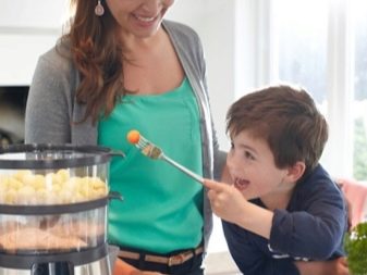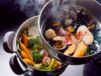 Diese Modelle sind analog zu den meisten Dampfkochtöpfen, die im Verkauf zu sehen sind. Im unteren Teil des Produkts befindet sich eine Kammer zum Erhitzen von Wasser, von wo der Dampf eintritt. Darüber ist ein Fach, das Nahrung für die Platzierung, die dank vorbereitet wird, aus dem unteren Abteil durch heißen Dampf zu betreten.