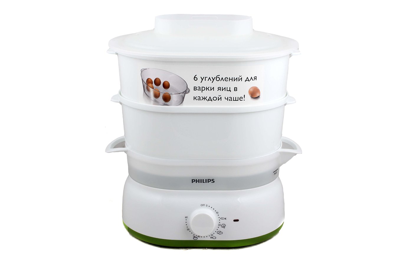 Komplett mit einem Doppelkessel geht Schüssel, in einem der Körbe. In dieser Schüssel können Sie Reis kochen. Und ein weiteres Merkmal eines Doppelkochers ist Halter für sechs Eier.