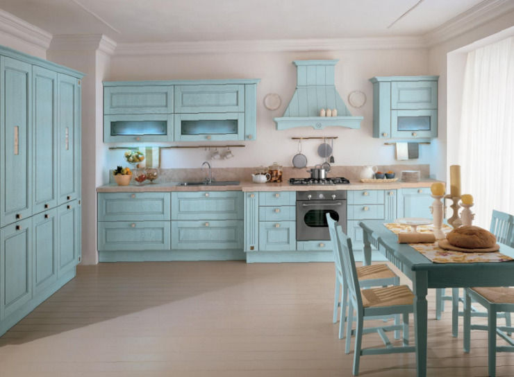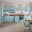 Im Inneren jeder Küche wird gut glänzend olivgrün oder blau Boden aussehen.Es passt gut zu dunkleren Grüntönen, Weiß und Schwarz. Wenn Sie zwei oder drei interessante Farben auswählen, können Sie die Küche schön arrangieren. In dieser Ausführungsform können Sie einen Olivenpolymer-Selbstnivellierungsboden herstellen und eine Küchengarnitur mit Fassaden des gleichen Farbtons aufnehmen.