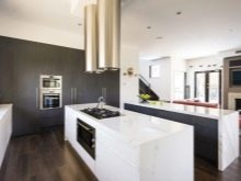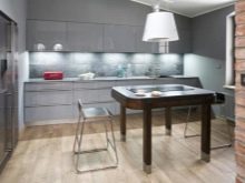 Experten empfehlen, entweder einen ruhigen Ton zu wählen, der die Rolle des Hintergrundes für die Kücheneinheit und andere Möbel spielt, oder den Boden heller zu machen, Akzente zu setzen und interessante Stylingmuster zu verwenden. Sie versichern das Für die Küche ist gut geeignet und die Kombination von Materialiendie in verschiedenen Funktionsbereichen gestapelt sind. In diesem Fall empfehlen sie, die Schürze mit Keramikfliesen auszustatten und den Essbereich mit Parkett oder Laminat abzudecken.