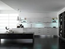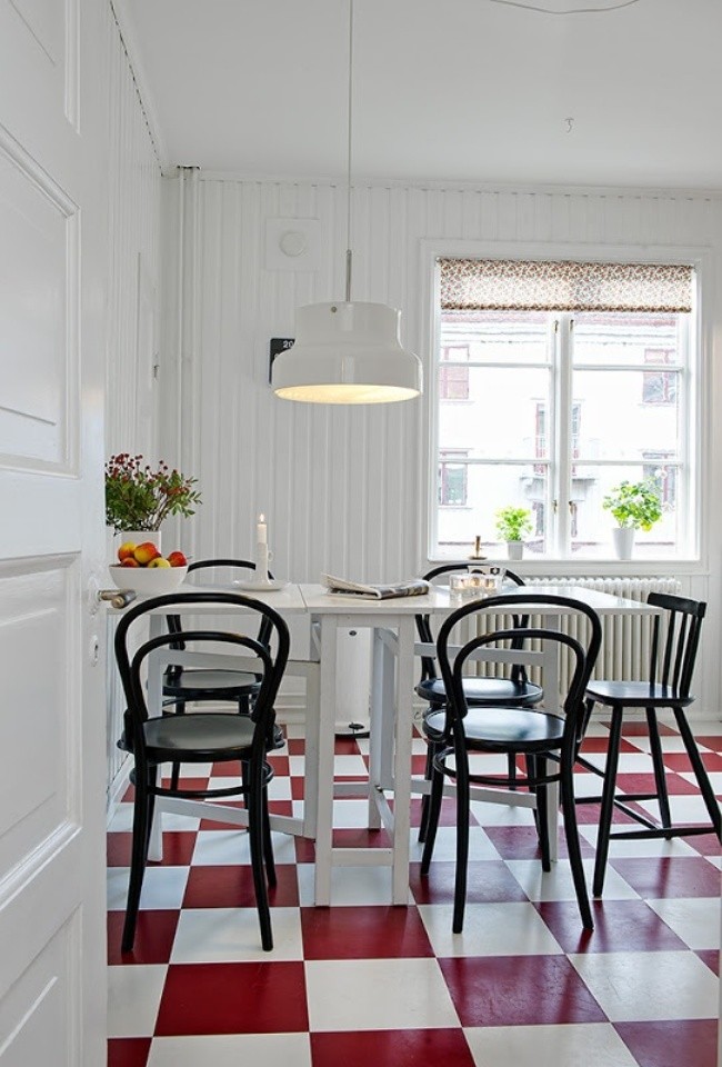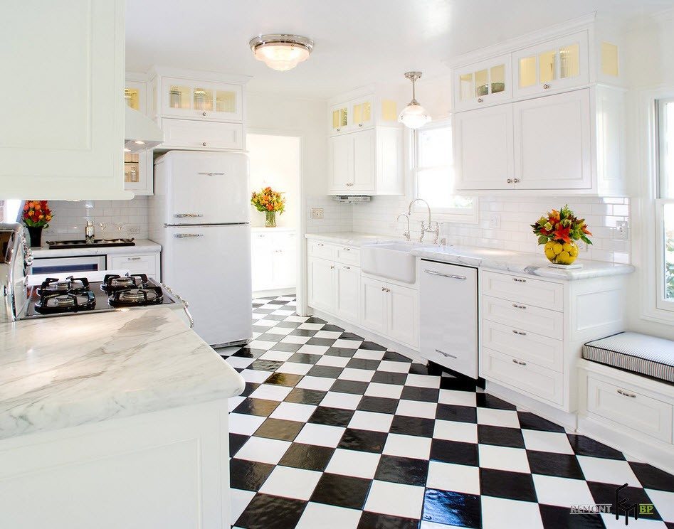 Bei der Auswahl einer Bodenfarbe oft auf Kontrast spielen: dunkler und heller Boden oder umgekehrt. Jetzt bevorzugen sie oft ein helleres Farbschema, besonders im Hinblick auf moderne Kücheninterieurs. Wählen Sie Farbe, meist glänzende Beschichtungen.