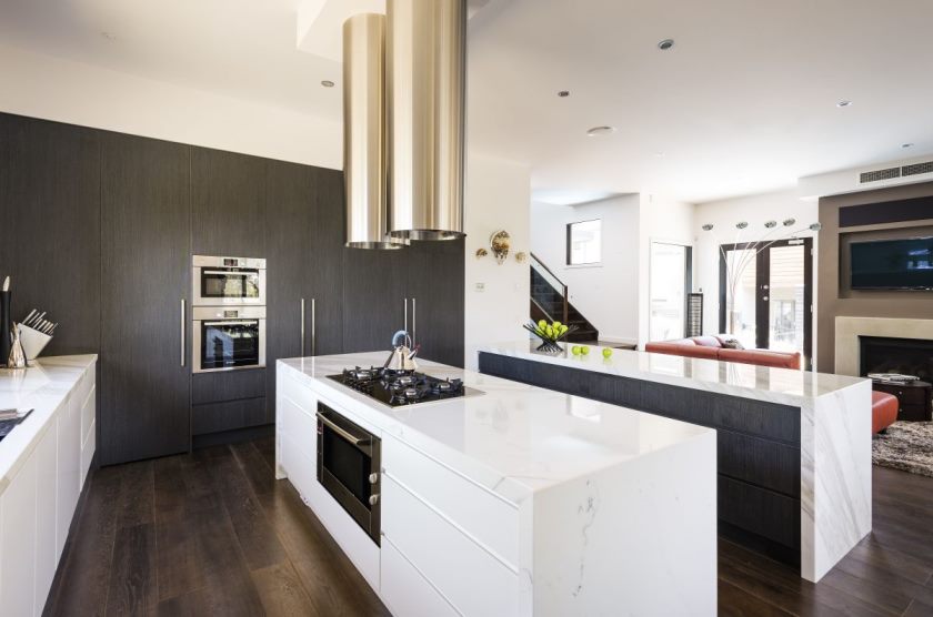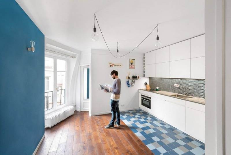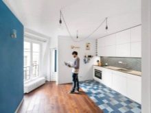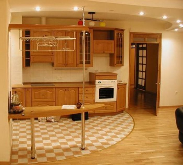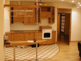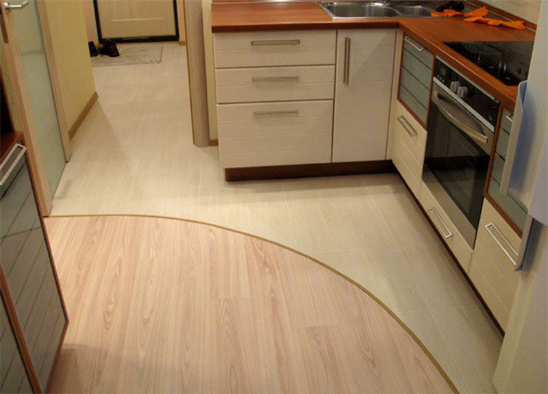 Bei der Kombination ist es wichtig, die Dicke des Fußbodens zu berücksichtigen, so dass keine offensichtlichen Fugen auf dem Boden vorhanden sind. Andernfalls müssen Sie einen mehrstufigen Boden verwenden. Die Kombination von Bodenbelag macht die Küche geteilt.Darüber hinaus ist es eine großartige Lösung für Studio-Apartments.