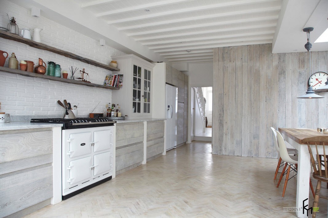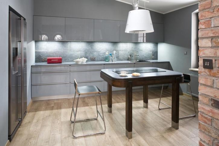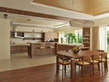 Für die Zone der Schürze ist perfekte Fliese oder Porzellan. Aber der Bereich zum Essen ist am häufigsten mit Parkett, Laminat und sogar Naturholz getrimmt. Diese Zone wird weniger anfällig für mechanische Beanspruchung sein, so dass die Qualitätsmerkmale und Kriterien für die Auswahl der Abdeckung des Essbereiches nicht so streng sein werden.