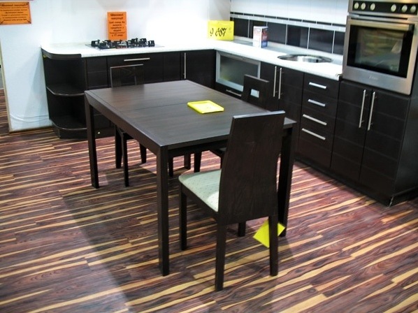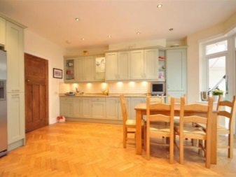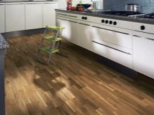 Holzbeschichtungen wie Naturholz oder Parkett sowie Holzfußböden sind in der Küche zulässig.Ihr großer Vorteil ist die elegante Erscheinung und Haltbarkeit. Sehr wichtig ist ihre Umweltfreundlichkeit. Gleichzeitig ist das Material teuer. Sie müssen nur solche Beschichtungen kaufen, die gut vor Feuchtigkeit geschützt sind und eine spezielle Markierung auf der Verpackung haben.