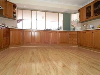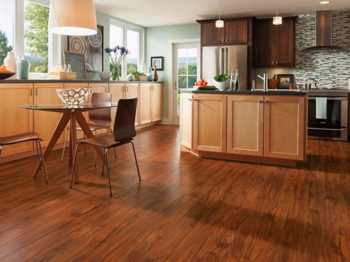 Küchenböden sollten sein verschleißfestDa mechanische Belastungen in diesem Raum unvermeidbar sind. Daher muss die Beschichtung eine spezielle Schutzschicht aufweisen, die die Optik und die Qualität des Bodens nicht beeinträchtigt. Außerdem müssen sie gegen äußere Einflüsse und Beschädigungen beständig sein. Dies ist aufgrund der Besonderheiten dieses Raumes, weil die Küche oft Besteck, Messer, Teller und sogar Töpfe fallen. Der Boden muss sehr stark und stark sein.