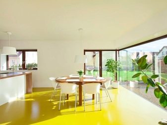 Selbstnivellierender Boden kann leicht gewaschen und gereinigt werden, sogar mit einer Bürste. Äußerlich sieht es sehr vorzeigbar aus, aber nicht immer zur Kombination geeignet.