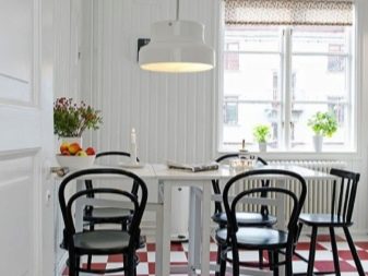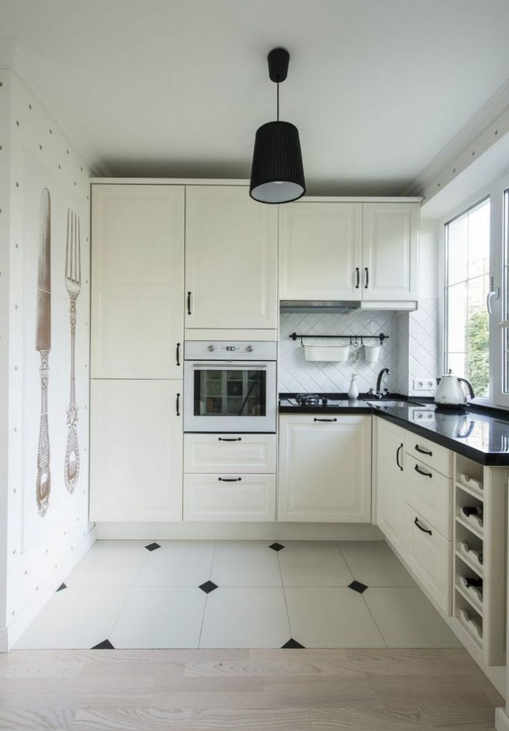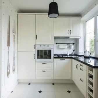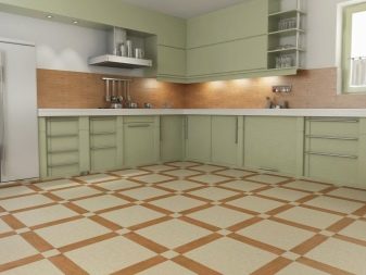 Mit der richtigen Kombination von Farben und Mustern auf dem Boden können Sie den Raum geräumiger gestalten. In einer kleinen Küche ist es besser, beige Fliesen mit einem diagonalen Muster zu legen, die benachbarte Farbtöne aus der gleichen Farbpalette kombinieren, aber für breitere Küchen können Sie interessante und farbenfrohe Lösungen und Kombinationen finden.