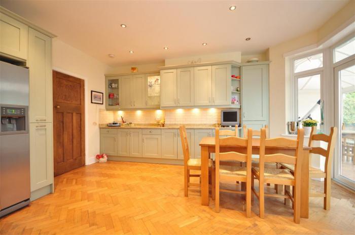Ein Holzboden zum Bemalen eignet sich für eine Küche in einem Privathaus, er sieht natürlich aus und passt zu einem klassischen Interieur.