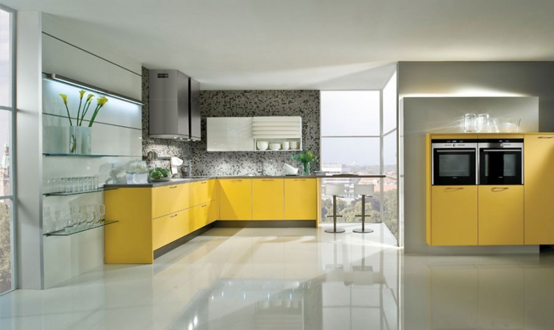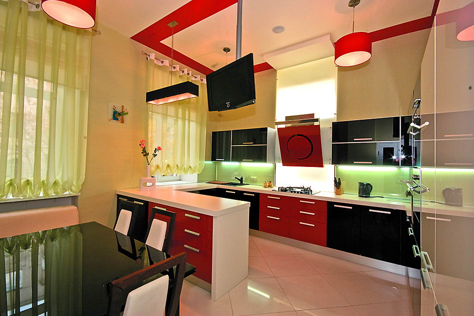 Die farbliche Hervorhebung kann in einigen Details im Interieur wiederholt werden, wodurch es möglich ist, das Design der Küche harmonischer und vollständiger zu gestalten.