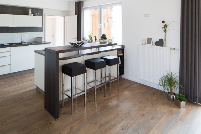 Wasserfestes Parkett ist eine ausgezeichnete Lösung für eine klassische Küche. Es sieht luxuriös aus und ist absolut sicher. Aber Nassreinigung ist besser, diesen Boden nicht mit äußerster Vorsicht zu missbrauchen und zu pflegen.