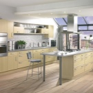 Laminat ist leicht zu reinigen und Schmutz zu entfernen. Zusammen mit ihm in der Küche können Sie leicht eine Heizung installieren, die auch sehr wichtig für die Bedingungen des nationalen Winters ist.