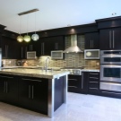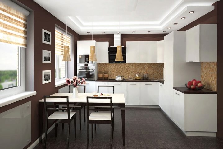 Eine Küche mit einem dunkelbraunen Boden ist ein echter Klassiker. Eine solche Beschichtung passt gut zu jedem Möbelstück und verleiht Luxus sogar eine kleine Küchenzeile. Die kontrastierende Kombination aus dunklem Boden und heller Tapete und Headset sieht toll aus.