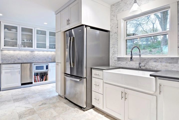 Beliebte Designerküchen ergänzen den Boden oft in Weiß. Durch die Verwendung einer solchen Lichtbeschichtung können Sie den Raum optisch erweitern. Darüber hinaus ist es sehr einfach, Möbel und Einrichtungsgegenstände aufzuheben. Aber, wie Sie verstehen, ist weiße Farbe eine der gebrandmarktsten. Daher verderben schon wenige Tropfen Soßen- oder Fettflecken, die nach dem Kochen übrig geblieben sind, sofort das Aussehen des Raumes.