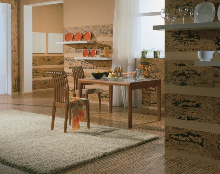 Nah an Holz in Bezug auf Umweltfreundlichkeit und attraktives Aussehen und ein Material wie Kork. Es ist weich genug zum Anfassen, daher gibt es ein Gefühl von Komfort, das in der Küche so notwendig ist.