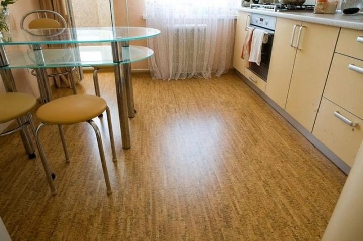 Um den Boden in der Küche zu decken, ist es am besten, das Material der natürlichen Farben zu verwenden - gelb-braun, beige, pastell. Gleichzeitig ist es jedoch wünschenswert, dass die Oberfläche des Materials mit einem speziellen Werkzeug imprägniert wurde, das verhindert, dass Sie die gesamte Feuchtigkeit und das Fett absorbieren.Richtig ausgewählter und gelegter Korkbezug wird Ihnen lange Freude bereiten und ästhetisch ansprechend bleiben.