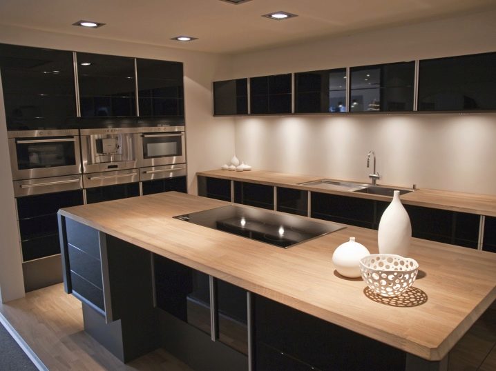 Küche mit einem schwarzen Boden ist heute keine Überraschung. Diese Stilentscheidung passt perfekt in das Interieur von Minimalismus, Loft oder High-Tech. Ausgezeichneter schwarzer Hintergrund kombiniert mit hellen Möbeln, aber von den hellen Schattierungen sollte aufgegeben werden.