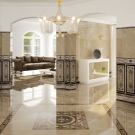 Die Fliese der dritten Klasse wird an Stellen mit mittlerer Intensität in normalen Schuhen (kleine Büros, Zimmer in Hotels, Wohnräume in einer Wohnung, einschließlich einer Halle) auf den Boden gelegt, jedoch ohne stark frequentierte Bereiche - Flure, Lobbys und Treppen.