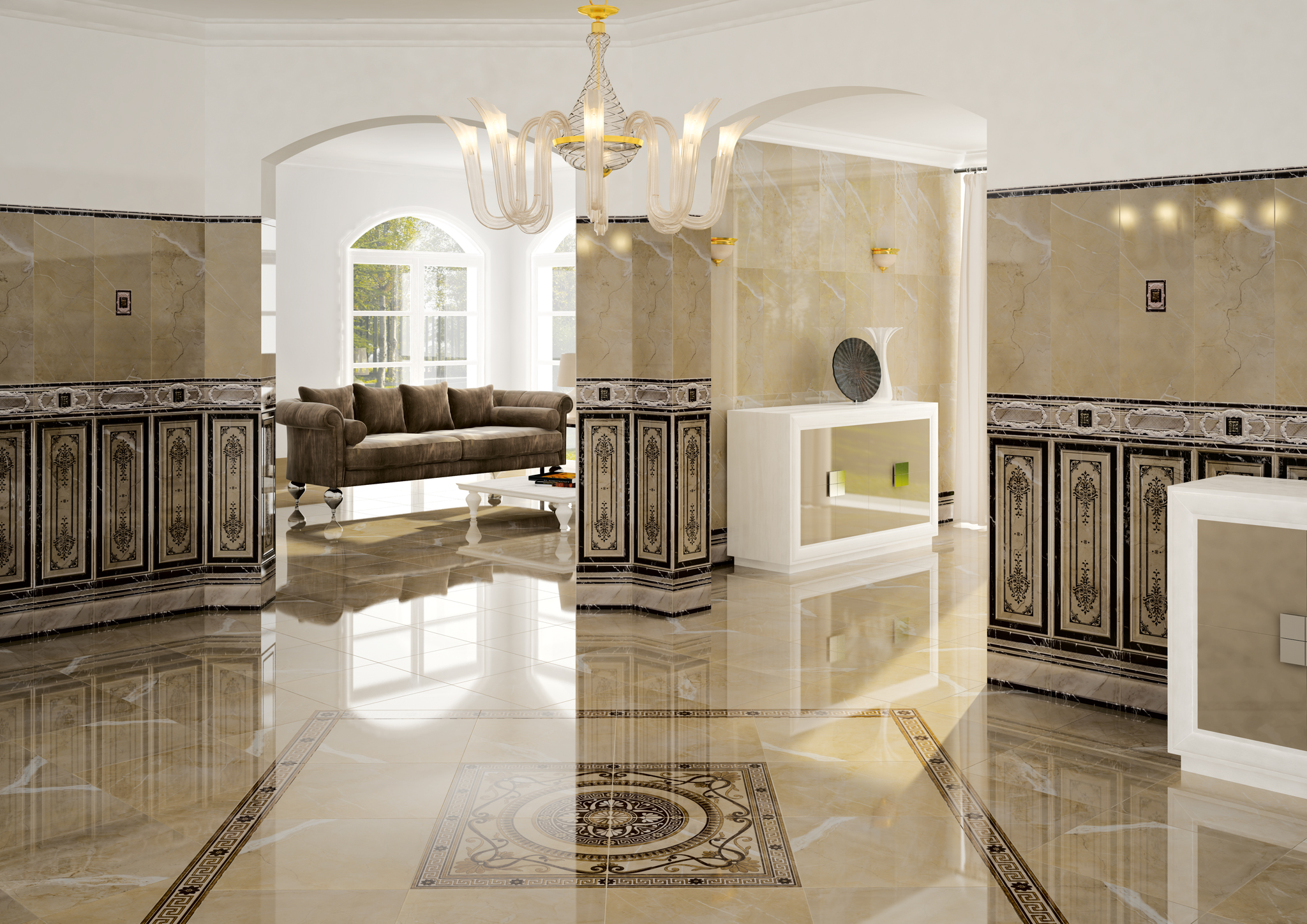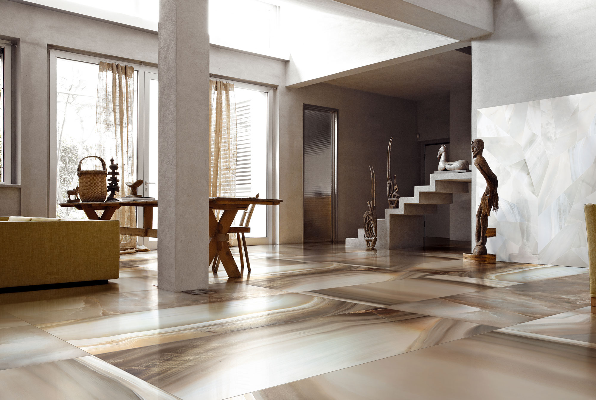Bedenken Sie bei der Wahl eines polierten Feinsteinzeugs, dass es sehr rutschig ist und trotz seiner Festigkeit im Laufe der Zeit an Glanz verliert, wenn Sie in Straßenschuhen darauf gehen.