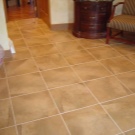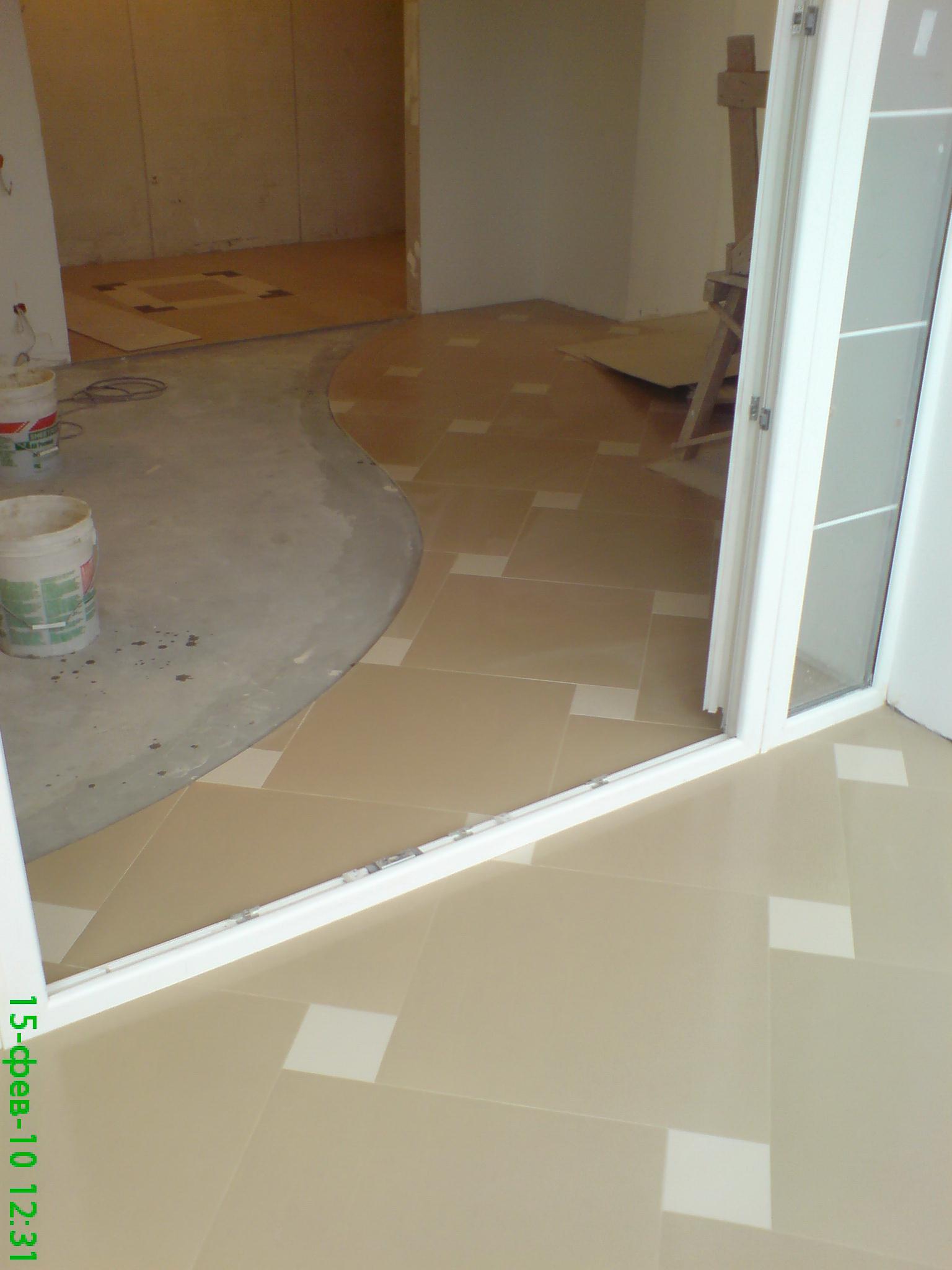 Für die Installation von Fliesen mit einem speziellen Kleber. Es sollte gut gerührt werden, keine Klumpen, dick. Nach dem Auftragen des Klebers und dem Entfernen überschüssiger Fliesen wird dieser sofort auf den Boden gelegt. Um den Abstand zwischen den Fliesen war das gleiche, verwenden Sie spezielle Kunststoffkreuze. Nach dem Verlegen werden die Nähte von überschüssigem Kleber befreit. Einen Tag später ist das Verfugen erledigt.
