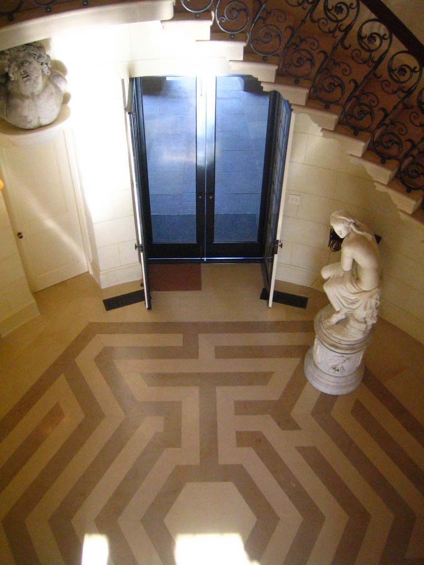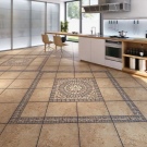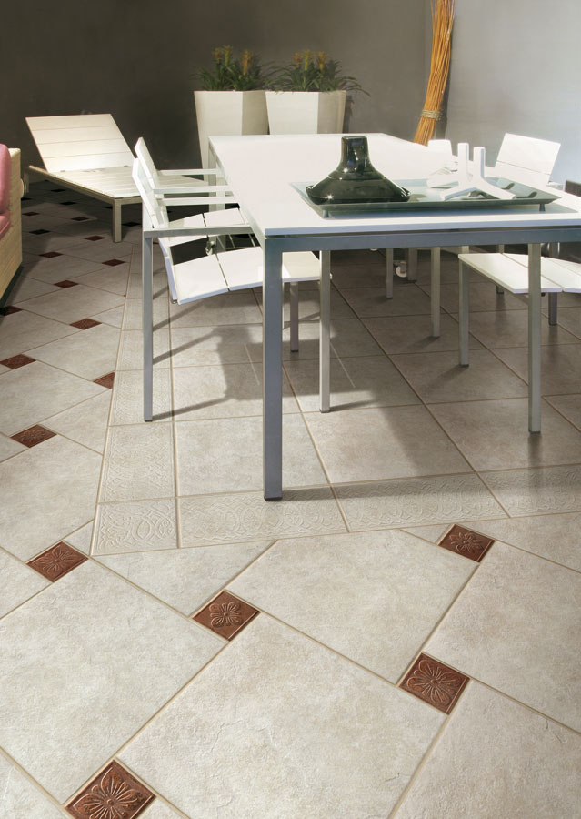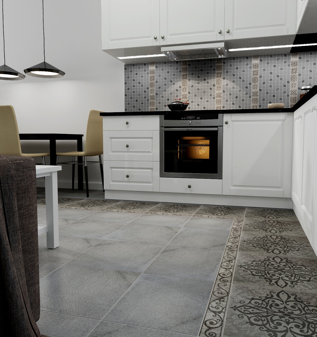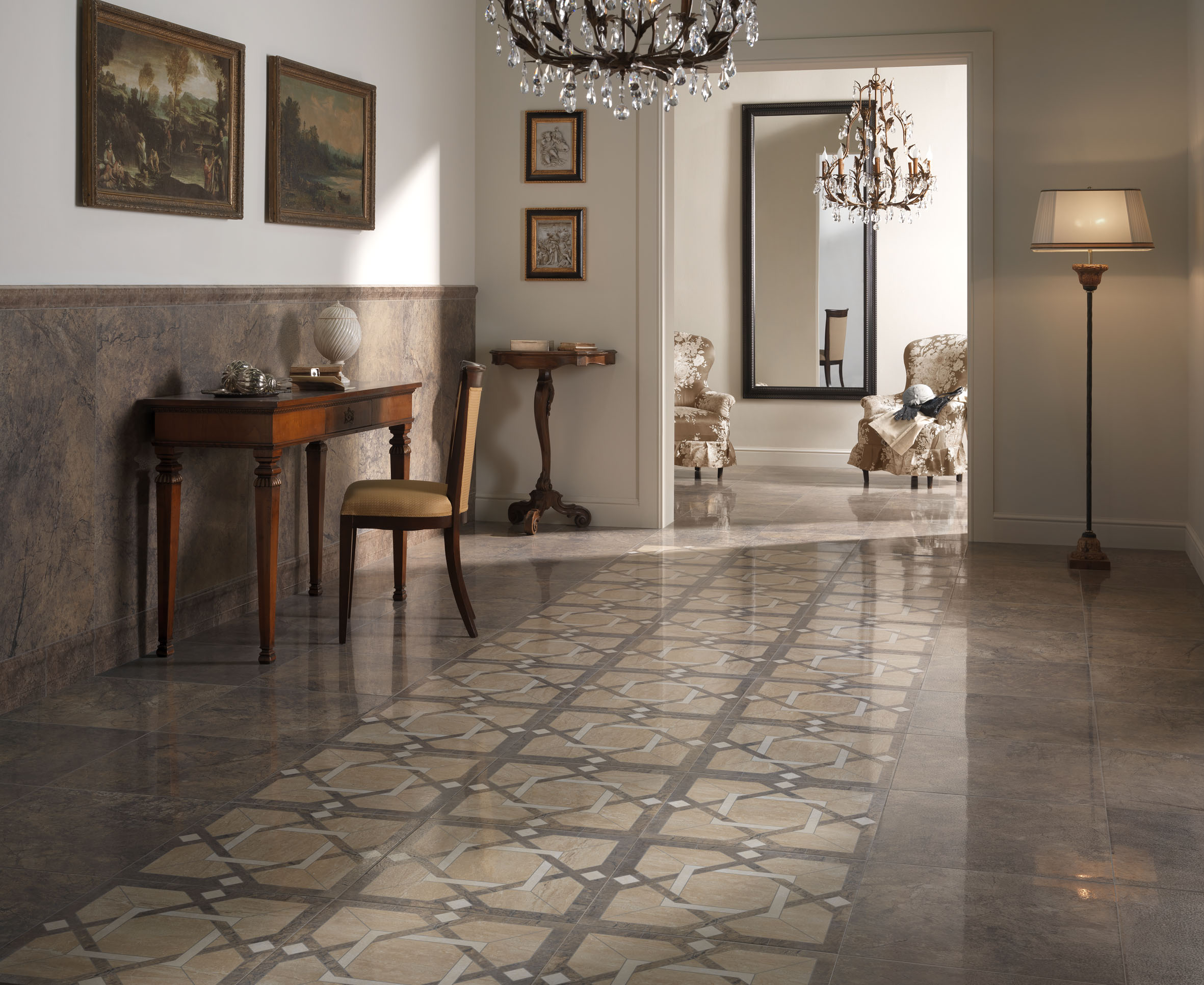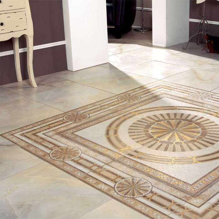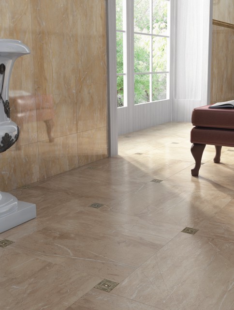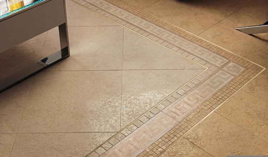 Satinierte Feinsteinzeugfliesen sind sehr schön, haben gute rutschhemmende Eigenschaften, halten aber keinen hohen Belastungen stand. Sehr geeignet für die Dekoration, um Elemente des Bodenmusters zu schaffen.