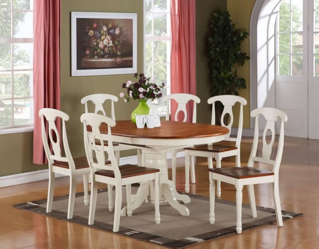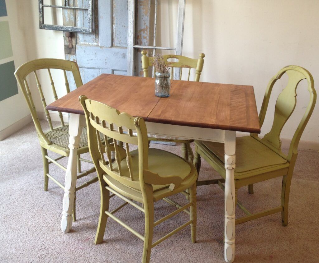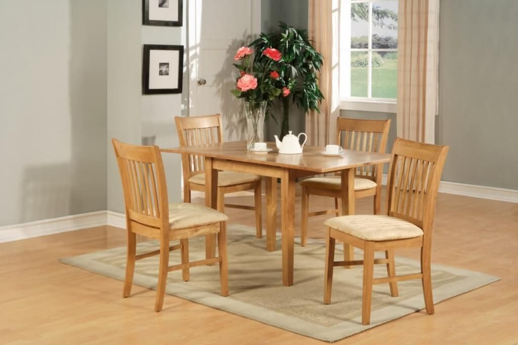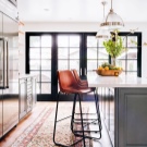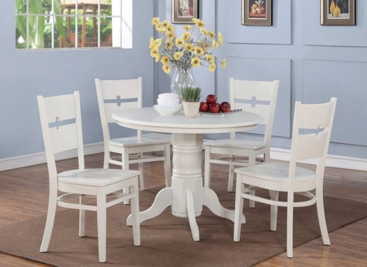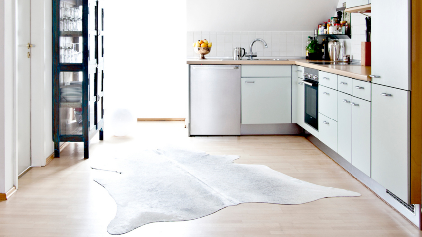 Wenn der Boden in der Küche mit weichem Linoleum bedeckt ist, verhindert ein Teppich unter dem Esstisch eine vorzeitige Verformung der Beine. Dadurch können Sie die Möbel in der Zukunft neu arrangieren, ohne befürchten zu müssen, dass hässliche Trampelpfade sichtbar werden.