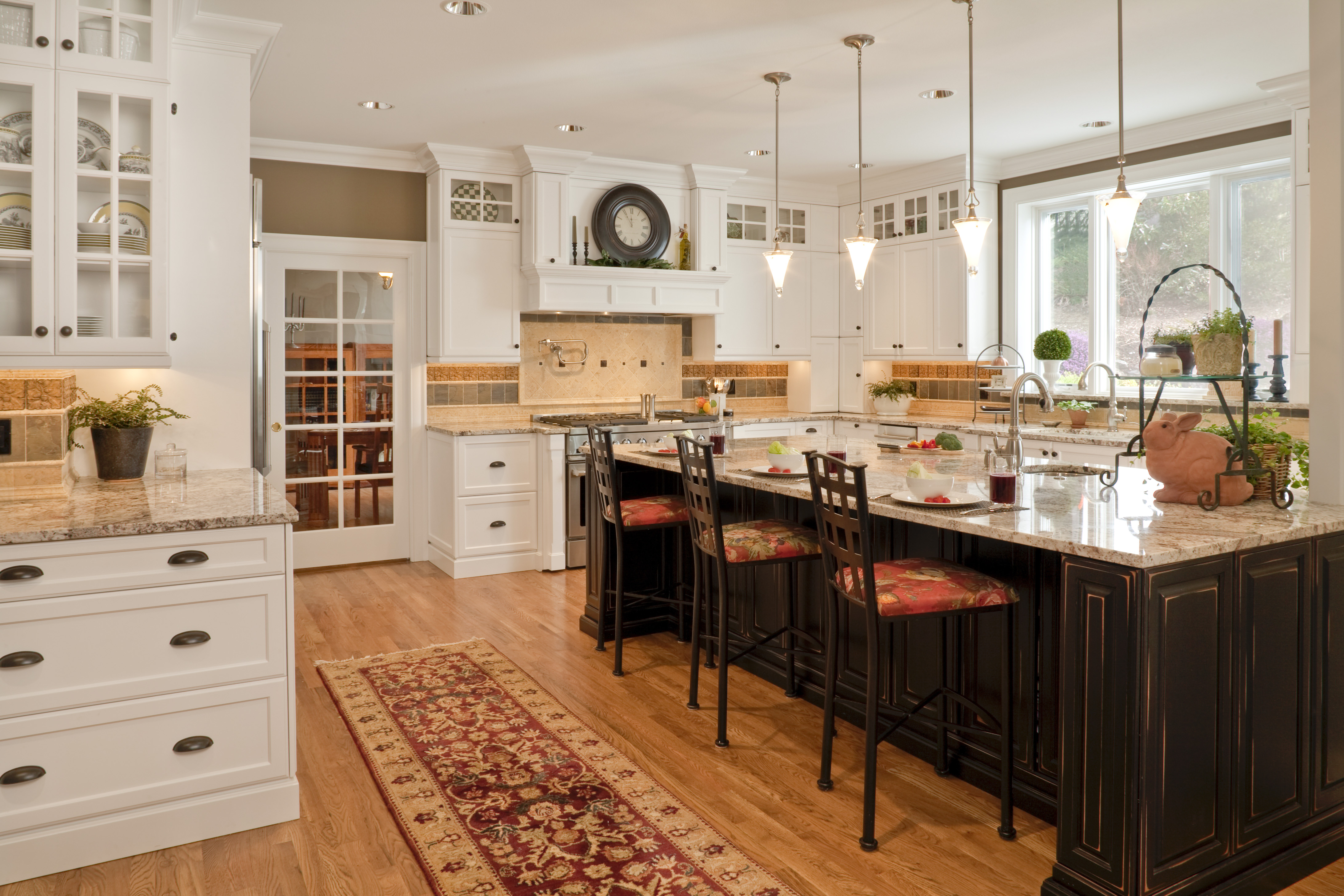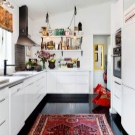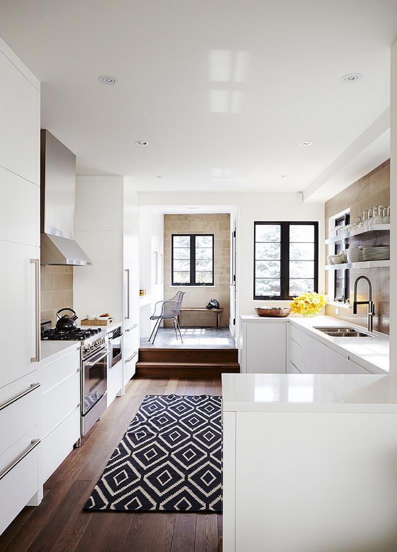 Spezielle schicke Küche in hellen Farben gibt einen schwarzen Teppich. Im Gegenteil, bei einem dunklen Küchenset und einem dunklen Boden wird ein weißer oder hellbeiger Teppich zu einem relevanten hellen Akzent.