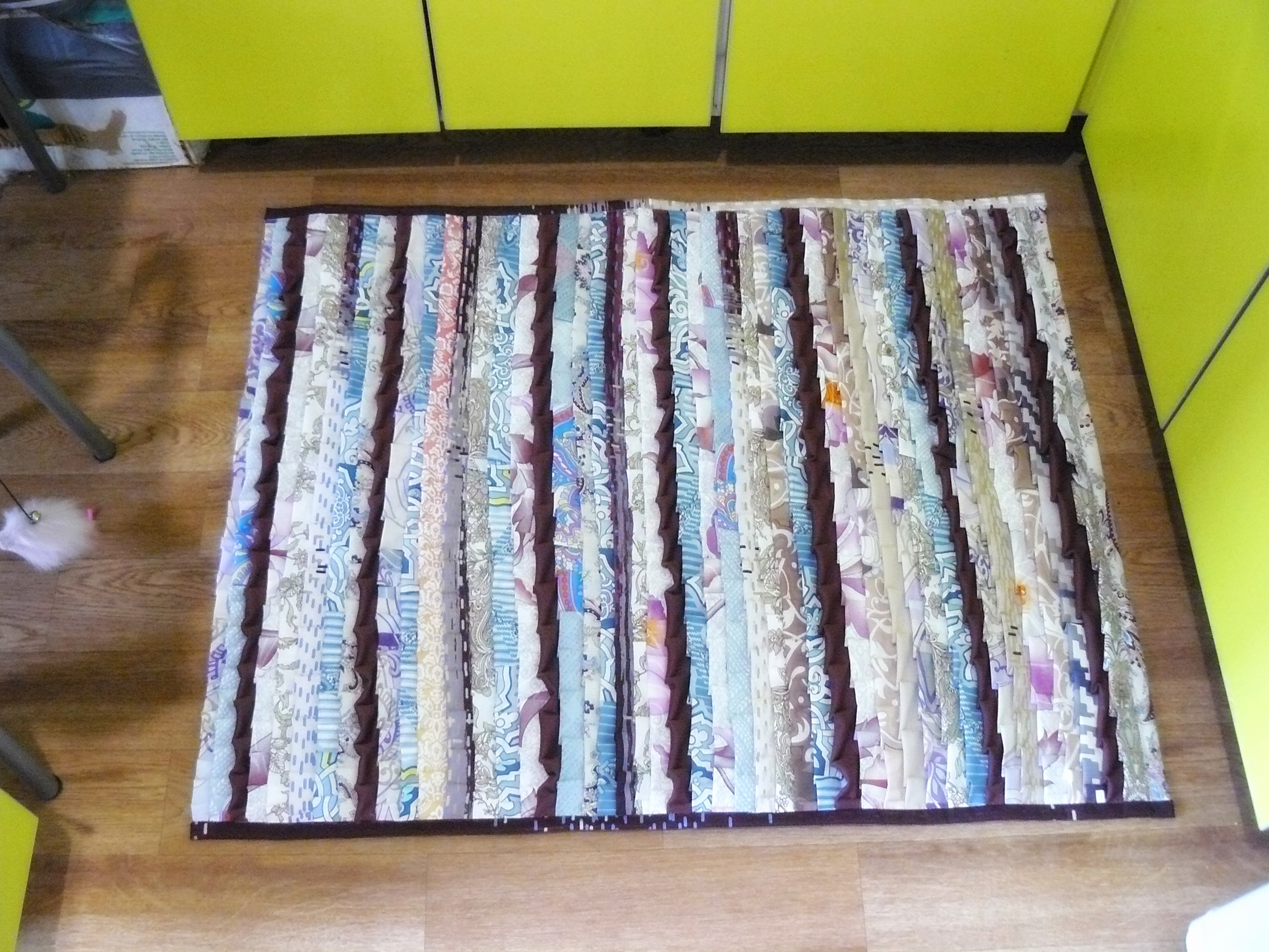 Schönes Produkt kann mit Patchwork-Technik erhalten werden. Um dies zu tun, wird der Stoff (wieder, alte Sachen werden tun), in Stücke der gleichen Größe und Form geschnitten. Aus diesen Teilen wird ein Stoff der gewünschten Größe und Form genäht.