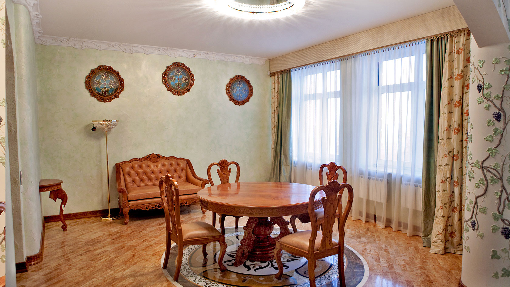 Bei der Auswahl eines Teppichs für den Essbereich ist zu beachten, dass dieser größer als der Tisch sein muss, damit Sie die Stühle frei ausfahren und zurückziehen können, ohne die Kanten zu berühren. Im Durchschnitt sind es auf jeder Seite etwa 60 cm. Es sollte auch genügend Platz zwischen den Kanten des Teppichs und anderen Möbeln - Nachttischen und Kleiderschränken - sein, sonst wird es sehr unangenehm sein, die Böden zu gehen und zu waschen.