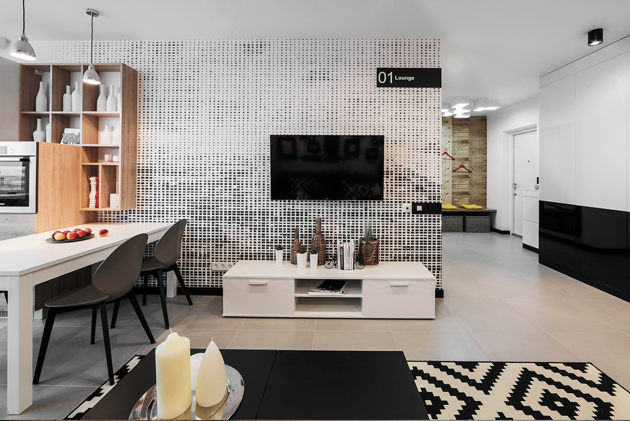 In einem bewusst sorglos und brutal wirkenden Loft-Interieur wird ein zurückhaltender, aber origineller Teppich aus modernen Vliesstoffen, eine ungewöhnliche Textur oder ein "rauer" Teppich aus Filz oder Filz gut aussehen. In einem lakonischen Innenraum wird ein High-Tech-Teppich, ein heller einfarbiger Teppich oder mit einem strengen geometrischen Muster ein geeigneter Akzent und beleben die Atmosphäre. Ein praktischer, dunkler Teppich passt auch in eine minimalistische Küche, wenn es das einzige dekorative Element ist.