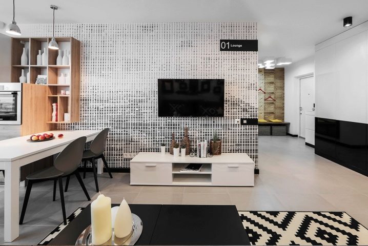 In Studio-Apartments, mit einem Teppich, ist es gut, den Raum einzuteilen - um das Wohnzimmer von der Küche, den Arbeitsbereich vom Essbereich zu trennen.