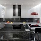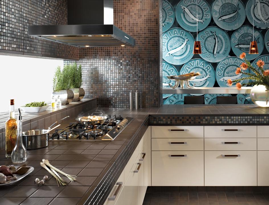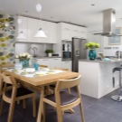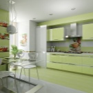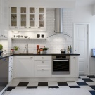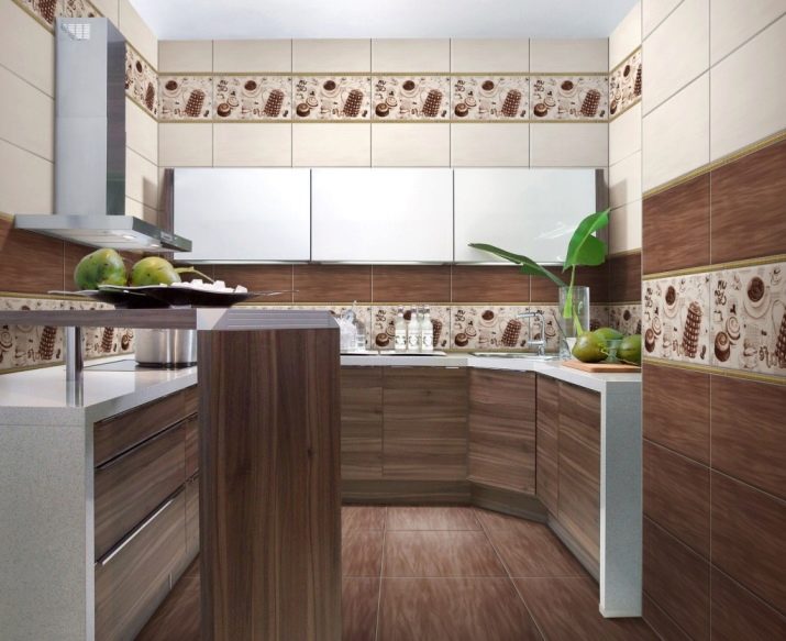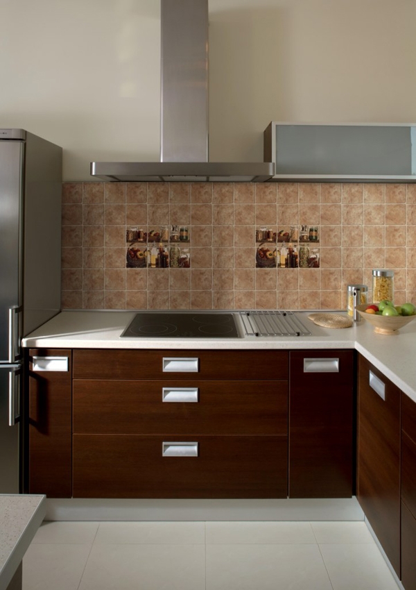 - Mit dem High-Tech- oder Minimalismus-Stil, nehmen Sie eine Kachel mit dem gleichen Ton in der Küche und sogar in den Flur oder mit einem schönen schlichten Ornament.