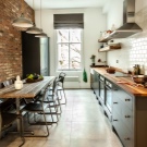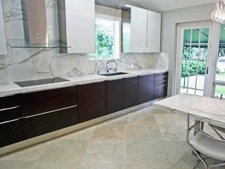 Wenn die Küche klein ist, ist es notwendig, sie aufgrund der hellen Schattierungen der Bodenfliese optisch zu vergrößern. Aber wenn der Küchenraum geräumig und frei ist, dann können Sie sicher dunkles Material kaufen, aber gleichzeitig ein weißes oder helles Möbelset wählen.