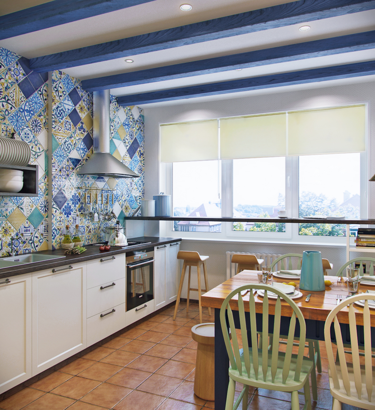 Wenn Sie die Küche nach Norden oder Westen und das minimale natürliche Licht drehen, ist es notwendig, eine Fliese mit einer warmen Tönung und vorzugsweise ohne Zeichnungen zu legen. Und im Gegenteil, mit der Sonnenseite können Sie sicher eine kalte Farbe und mit Ornamenten wählen.