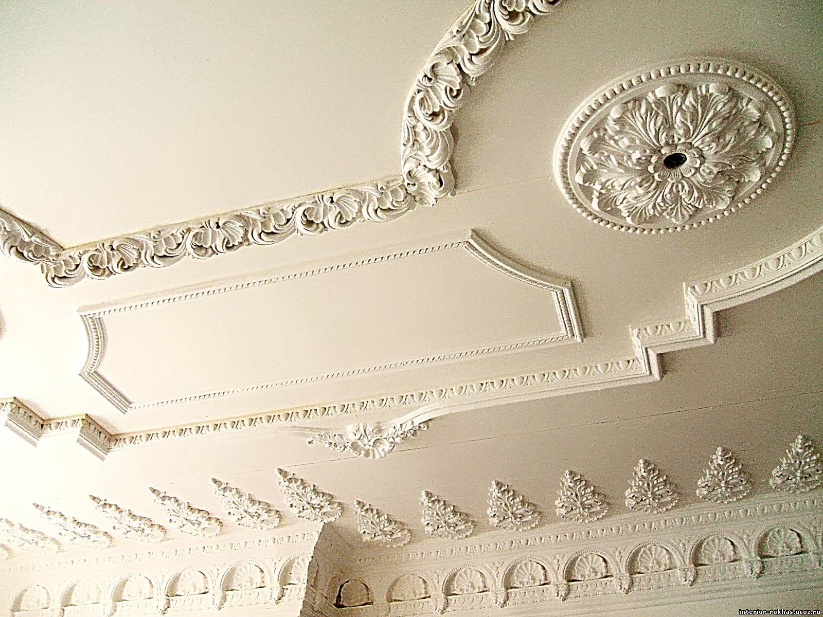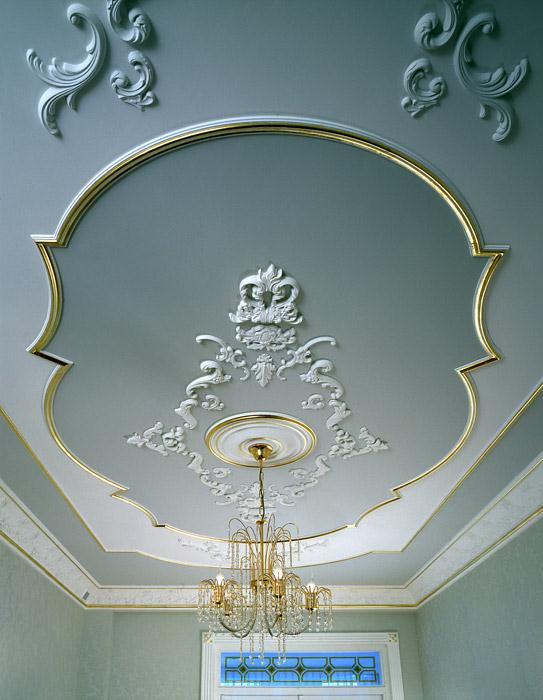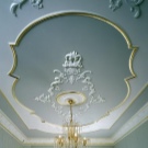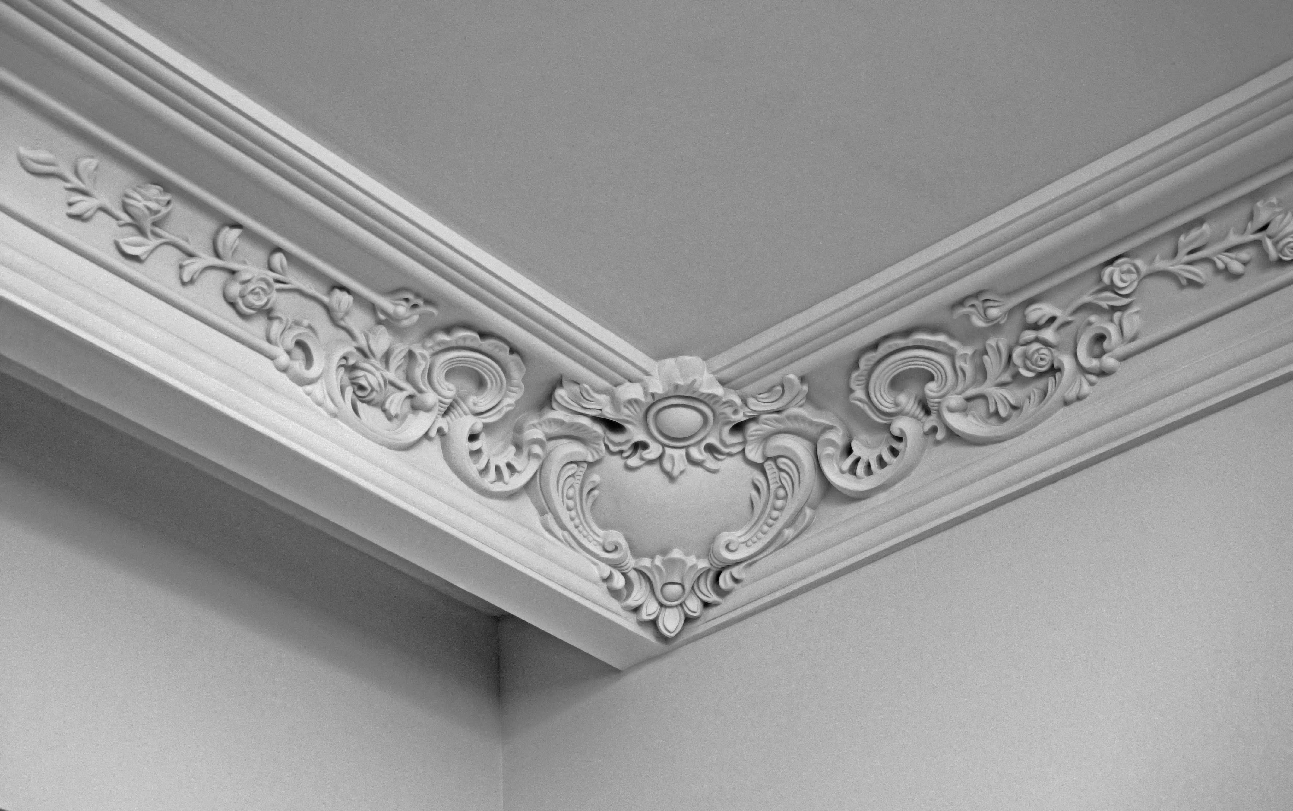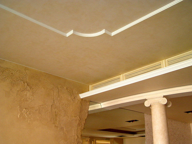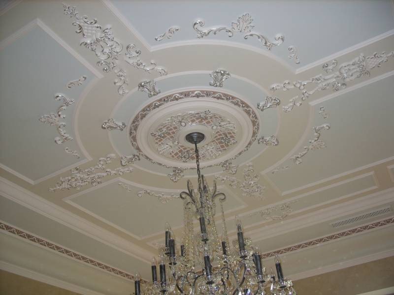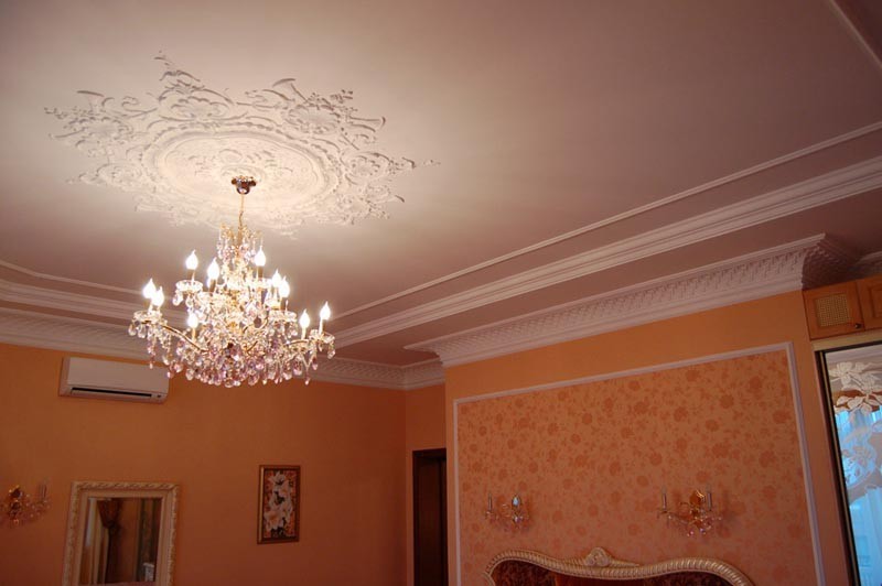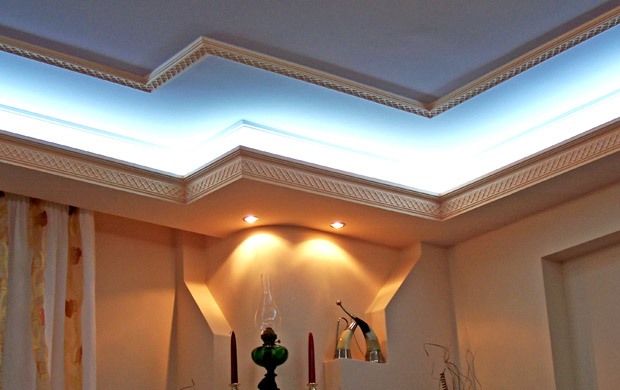 Laubarbeit wird helfen, ein echtes Kunstwerk über dem Kopf zu arrangieren. Geformte Streifen, Ornamente, Muster, asymmetrische oder symmetrische Linien - diese Technik schafft die Stimmung im Haus, die Sie wollen. Die Stuckdecke ist nicht billig, aber die Qualität stimmt mit dem Preis überein.