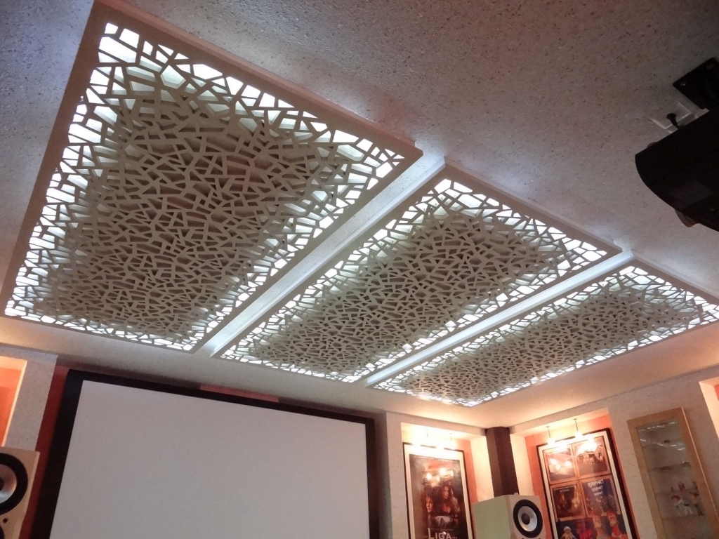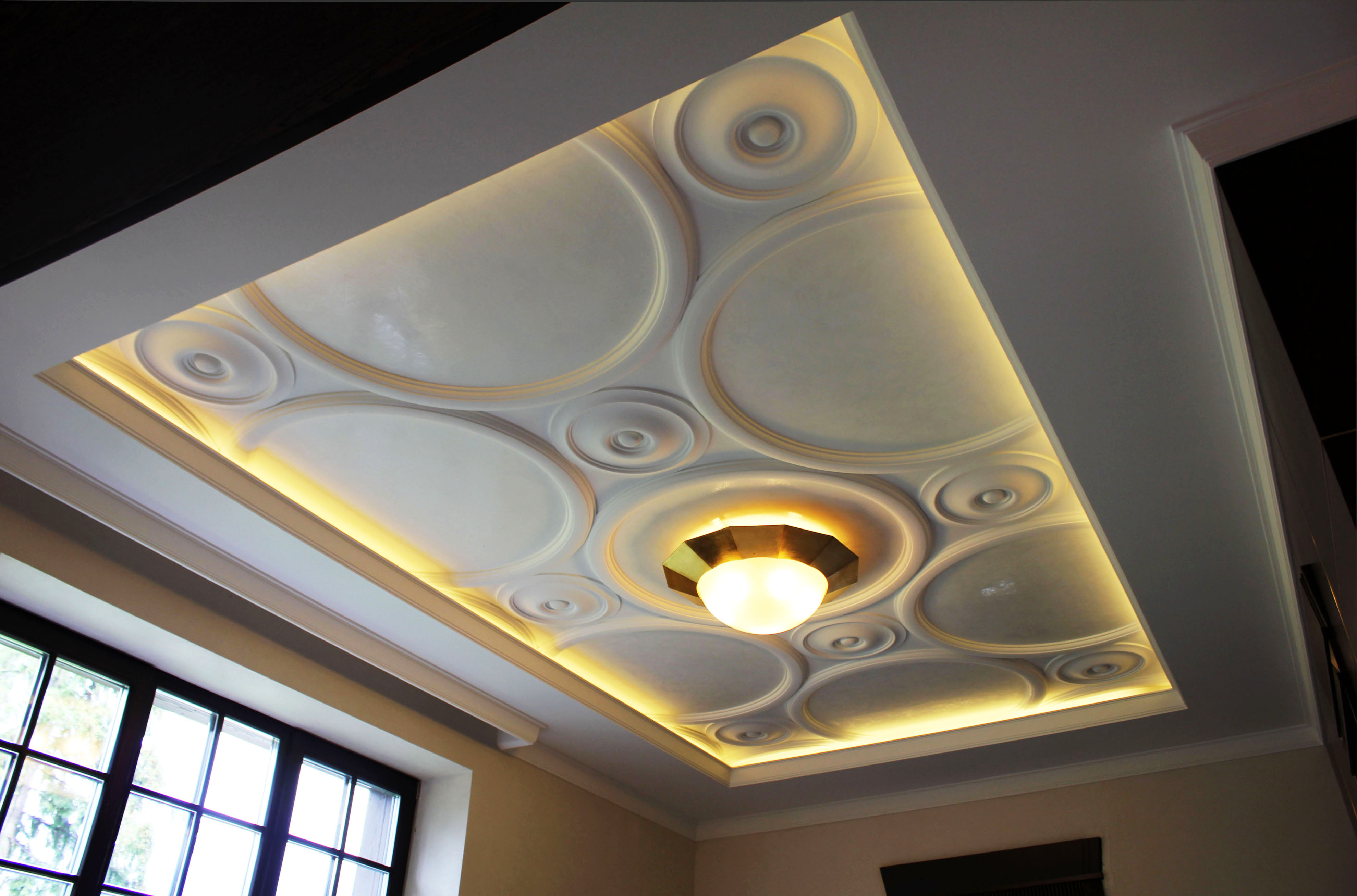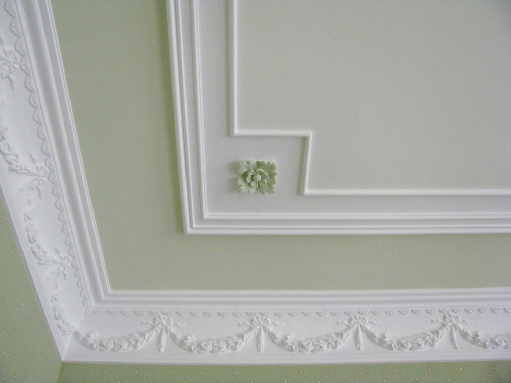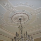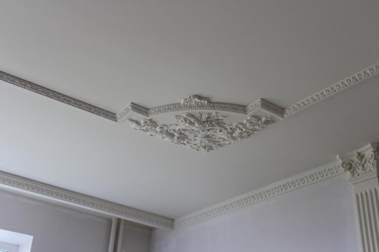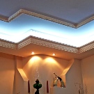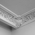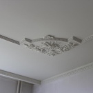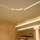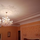 Laubarbeit wird helfen, ein echtes Kunstwerk über dem Kopf zu arrangieren. Geformte Streifen, Ornamente, Muster, asymmetrische oder symmetrische Linien - diese Technik schafft die Stimmung im Haus, die Sie wollen. Die Stuckdecke ist nicht billig, aber die Qualität stimmt mit dem Preis überein.