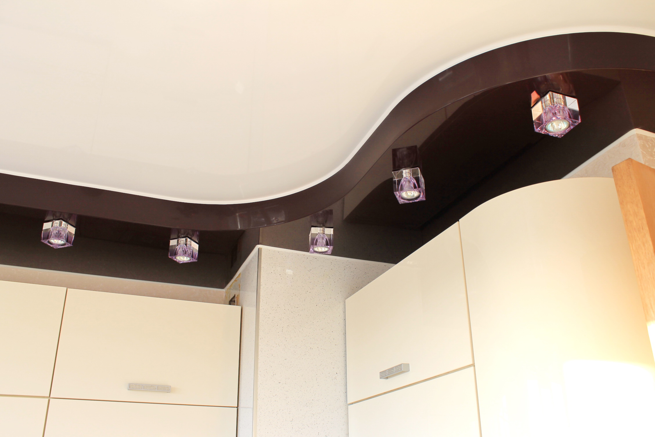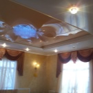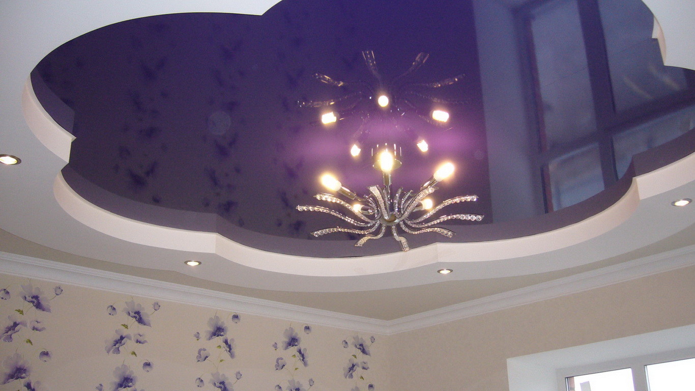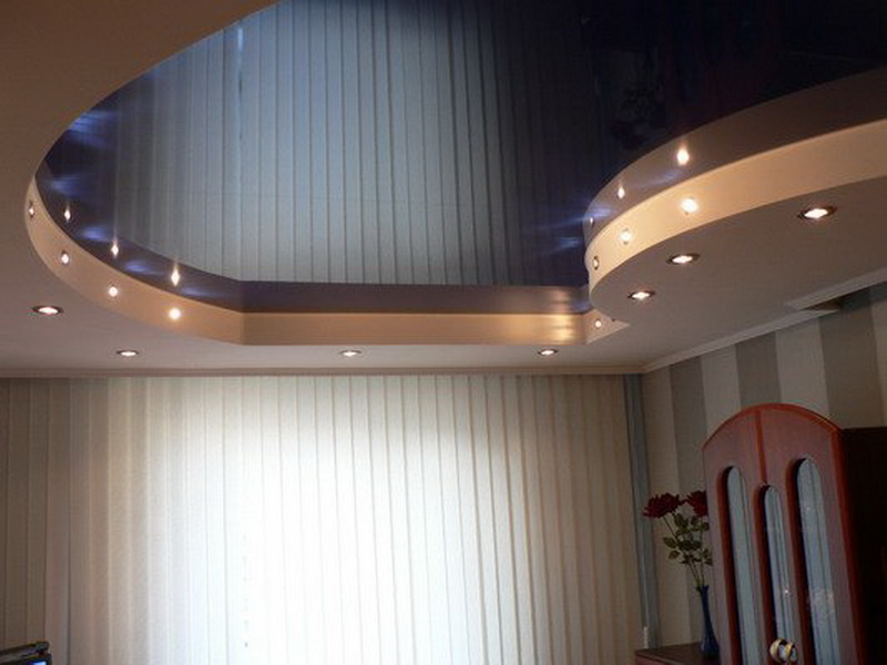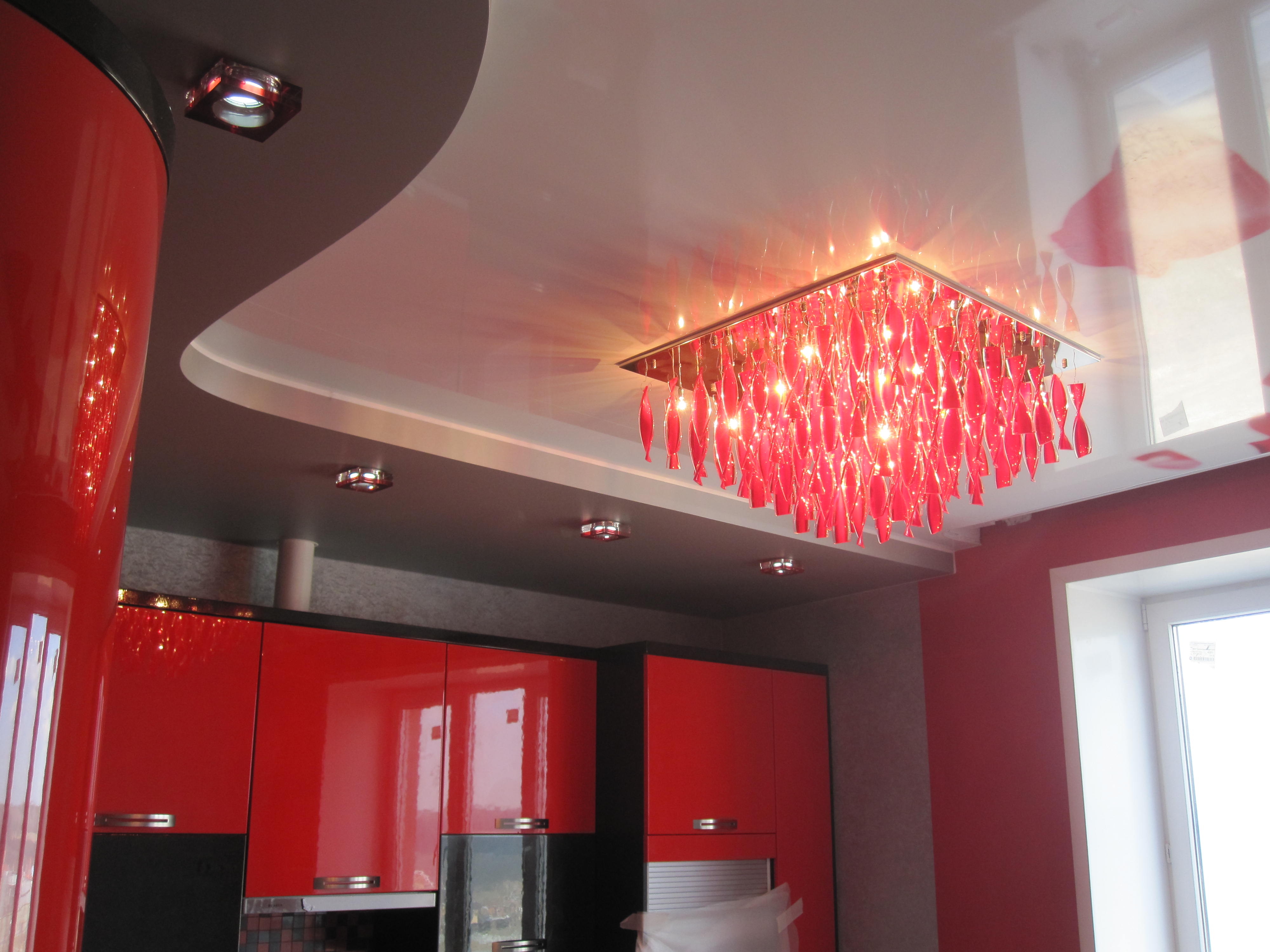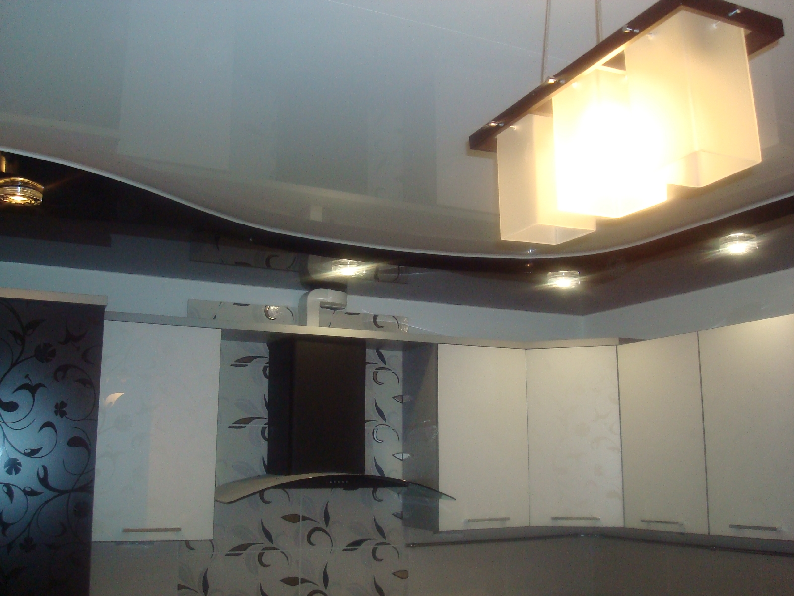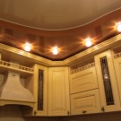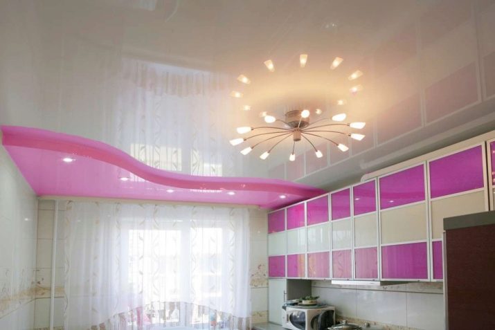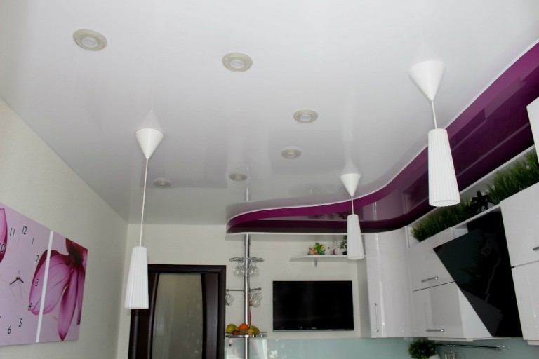 Jede zweistufige Decke hat eine Reihe von Vorteilen, weil sie nicht nur eine ästhetische, sondern auch eine praktische Funktion erfüllt.Mit ihm ist es so einfach, die Oberfläche der Decke zu nivellieren, um die Armaturen, Lüftungs- oder Klimaanlagen zu verbergen. Verwenden Sie dieses Design, um die Wärme- und Schalldämmung in der Küche zu erhöhen. Stretch-Decke, besteht aus zwei Ebenen, es sieht viel attraktiver, ausdrucksstarker als Modelle aus Trockenbau. Es stellte sich heraus, dass es sich um ein Tuch handelte, auf das man leicht ein Bild oder Foto anbringen konnte.