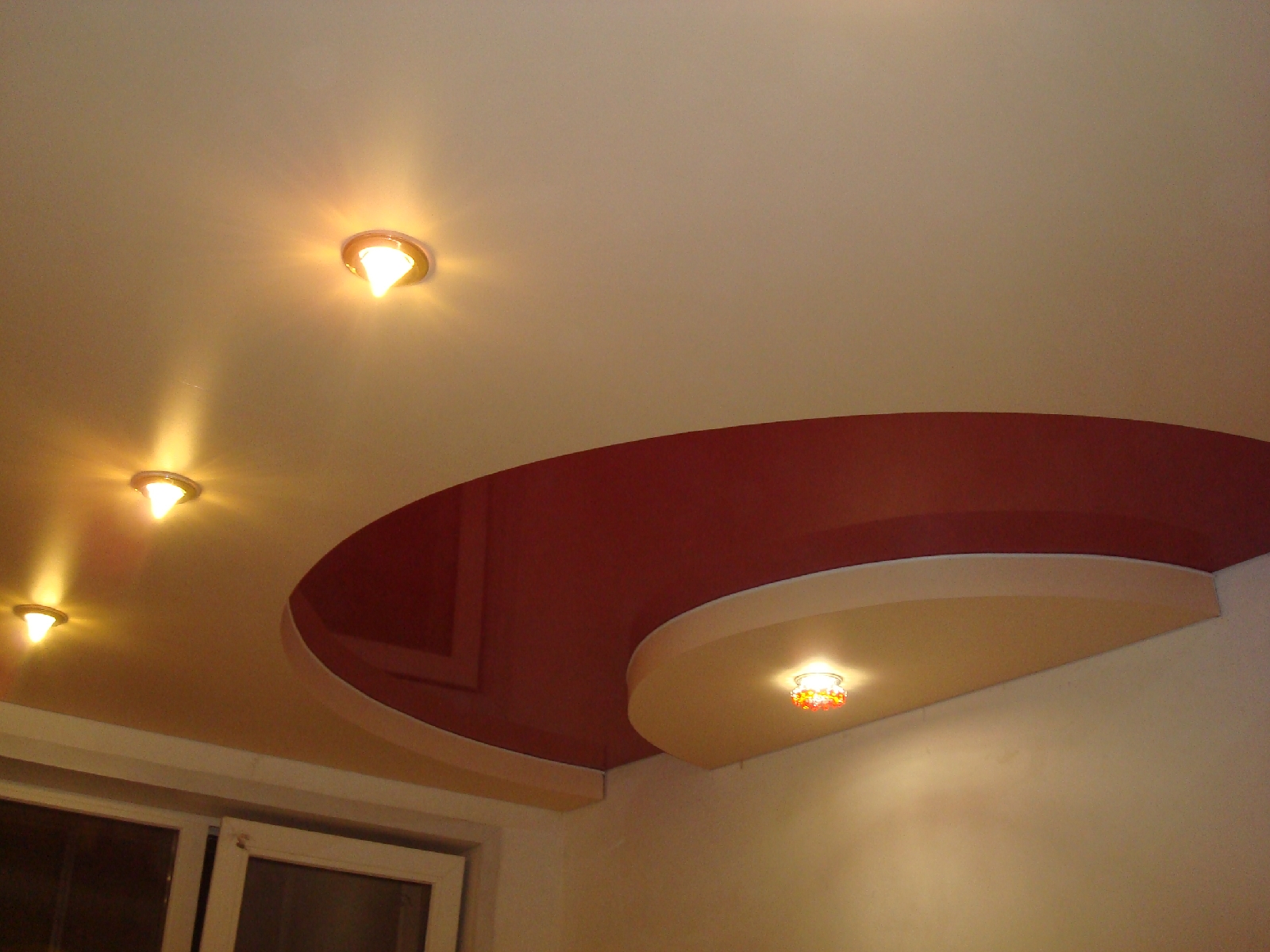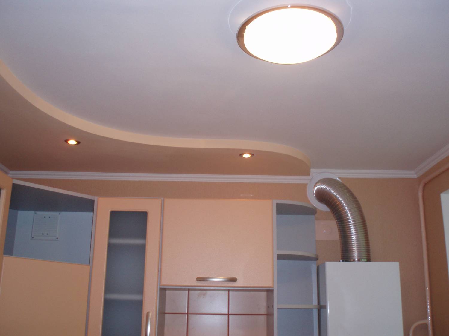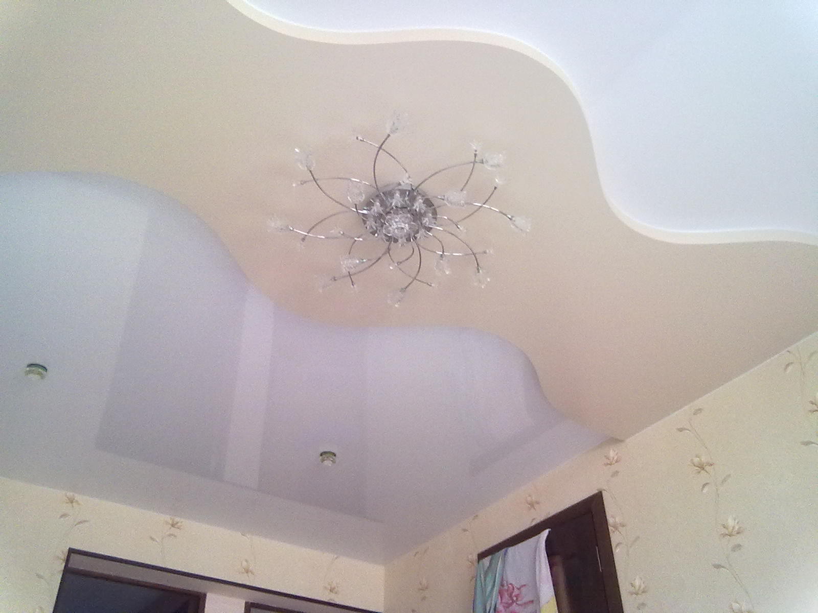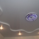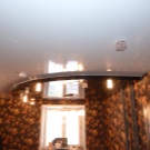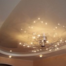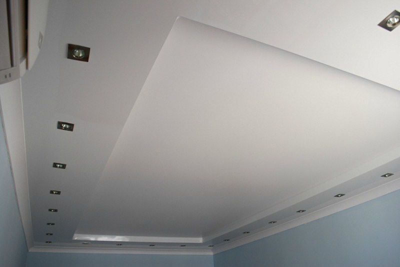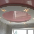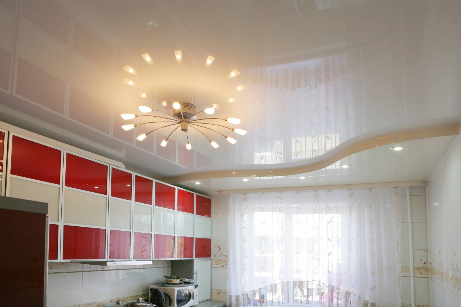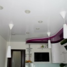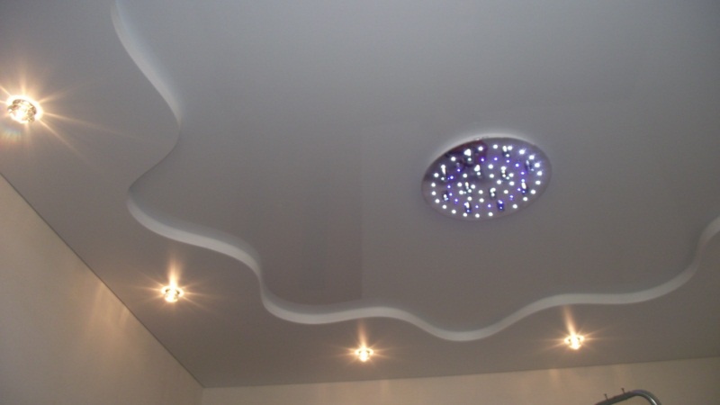 Jede zweistufige Decke hat eine Reihe von Vorteilen, weil sie nicht nur eine ästhetische, sondern auch eine praktische Funktion erfüllt.Mit ihm ist es so einfach, die Oberfläche der Decke zu nivellieren, um die Armaturen, Lüftungs- oder Klimaanlagen zu verbergen. Verwenden Sie dieses Design, um die Wärme- und Schalldämmung in der Küche zu erhöhen. Stretch-Decke, besteht aus zwei Ebenen, es sieht viel attraktiver, ausdrucksstarker als Modelle aus Trockenbau. Es stellte sich heraus, dass es sich um ein Tuch handelte, auf das man leicht ein Bild oder Foto anbringen konnte.