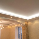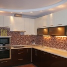 All dies ist mit lakonischen Lampen geschmückt, die direkt in einer der Ebenen montiert sind. Zwischen ihren "Lücken" können Sie eine interessante Kombination von Farben finden, die die Atmosphäre im Allgemeinen schmücken wird. Eine Kombination aus roter und kalter blauer Beleuchtung, gelben und grünen Schattierungen, Lila und Hellrosa, wirkt in der Küche harmonisch.