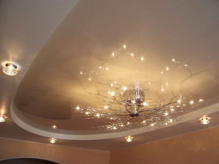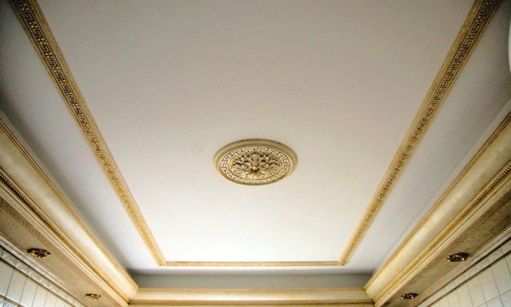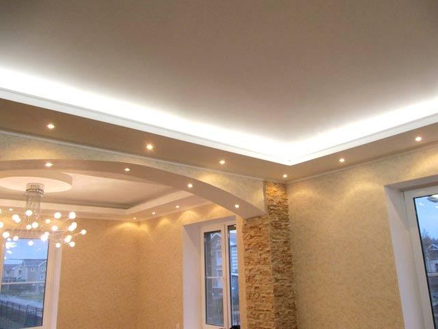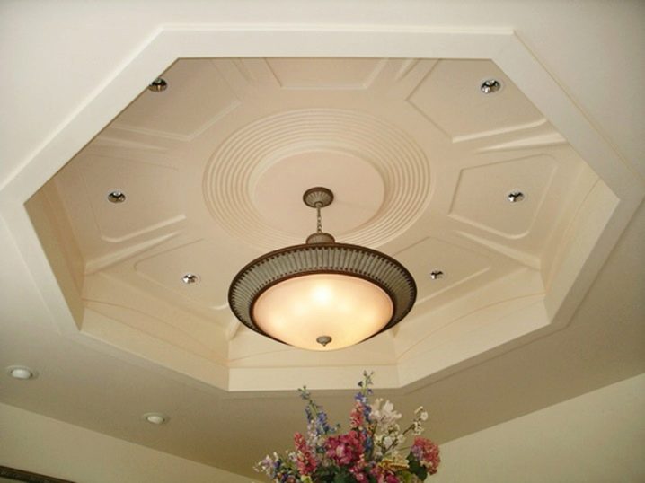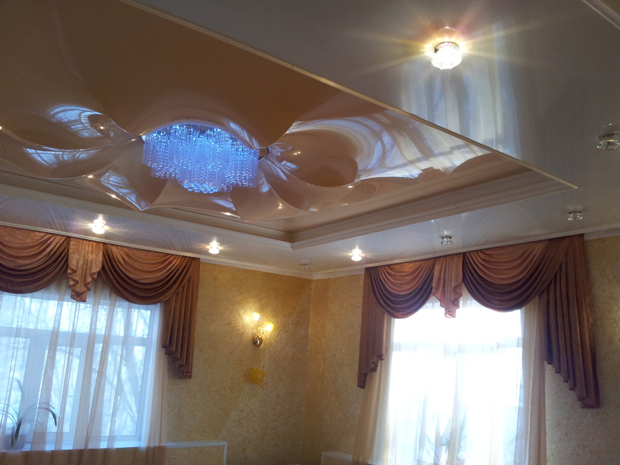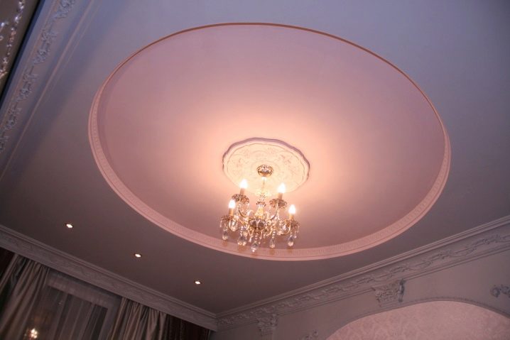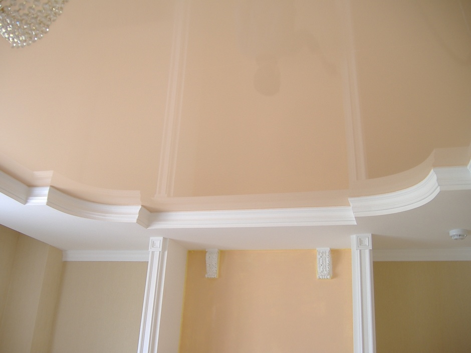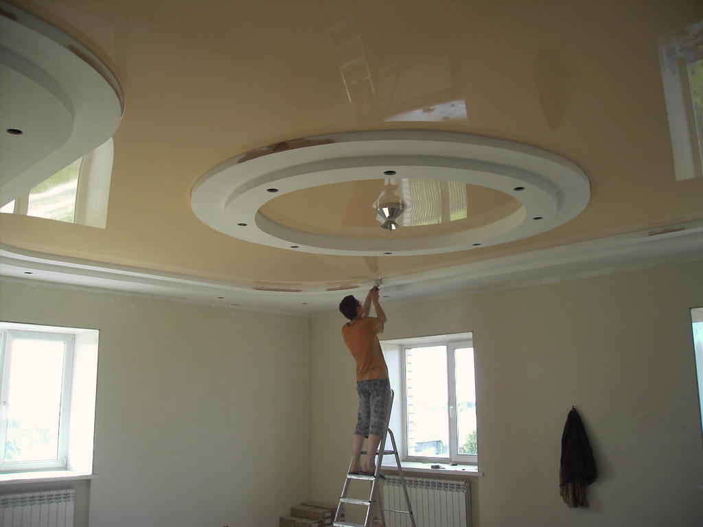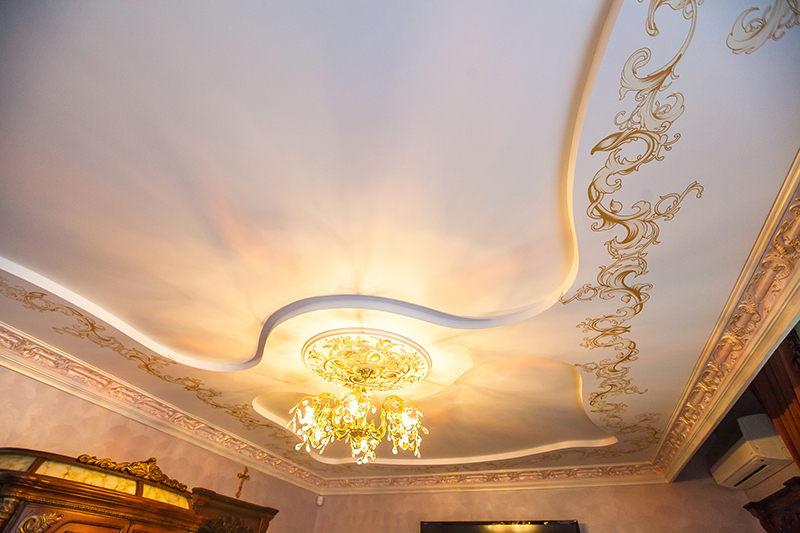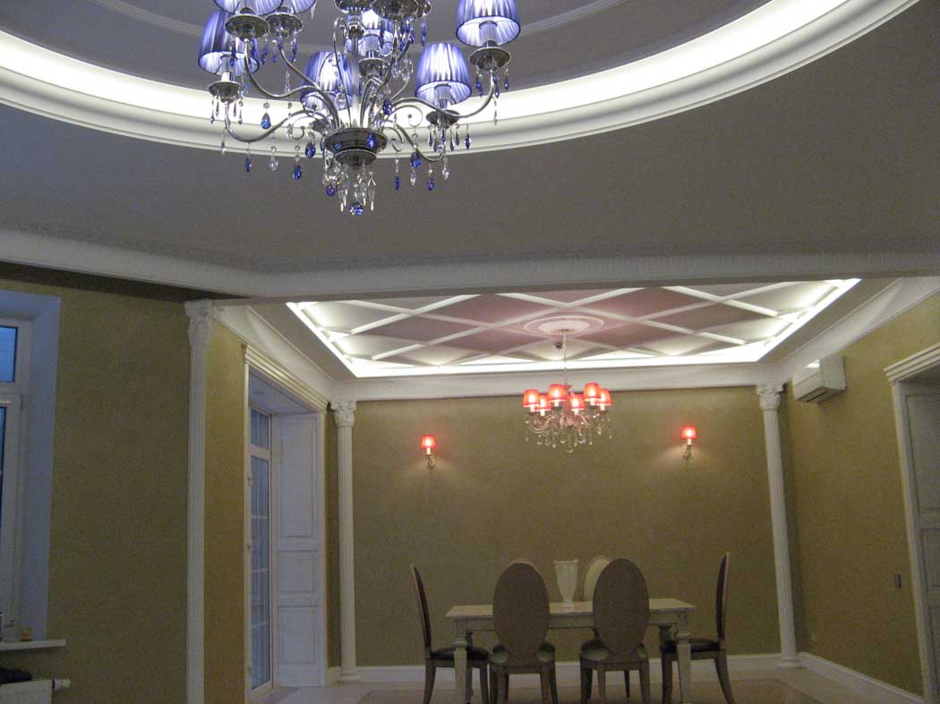Zweistöckige Decke ist eine gute Tradition, die auch in den königlichen Speisesälen beliebt war. Erinnere dich wenigstens an eine luxuriöse Decke in der Halle von Peterhof! Ein wichtiger Vorteil dieser Konstruktion ist, dass sie die Unzulänglichkeiten von Putz oder Mauerwerk, geschlossenen Decken, Drähten, Balken usw. leicht verbergen kann.